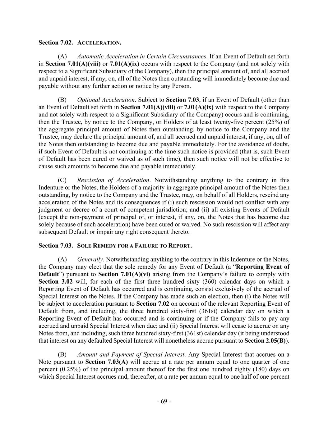 - 69 - Section 7.02. ACCELERATION. (A) Automatic Acceleration in Certain Circumstances. If an Event of Default set forth in Section 7.01(A)(viii) or 7.01(A)(ix) occurs with respect to the Company (and not solely with respect to a Significant Subsidiary of the Company), then the principal amount of, and all accrued and unpaid interest, if any, on, all of the Notes then outstanding will immediately become due and payable without any further action or notice by any Person. (B) Optional Acceleration. Subject to Section 7.03, if an Event of Default (other than an Event of Default set forth in Section 7.01(A)(viii) or 7.01(A)(ix) with respect to the Company and not solely with respect to a Significant Subsidiary of the Company) occurs and is continuing, then the Trustee, by notice to the Company, or Holders of at least twenty-five percent (25%) of the aggregate principal amount of Notes then outstanding, by notice to the Company and the Trustee, may declare the principal amount of, and all accrued and unpaid interest, if any, on, all of the Notes then outstanding to become due and payable immediately. For the avoidance of doubt, if such Event of Default is not continuing at the time such notice is provided (that is, such Event of Default has been cured or waived as of such time), then such notice will not be effective to cause such amounts to become due and payable immediately. (C) Rescission of Acceleration. Notwithstanding anything to the contrary in this Indenture or the Notes, the Holders of a majority in aggregate principal amount of the Notes then outstanding, by notice to the Company and the Trustee, may, on behalf of all Holders, rescind any acceleration of the Notes and its consequences if (i) such rescission would not conflict with any judgment or decree of a court of competent jurisdiction; and (ii) all existing Events of Default (except the non-payment of principal of, or interest, if any, on, the Notes that has become due solely because of such acceleration) have been cured or waived. No such rescission will affect any subsequent Default or impair any right consequent thereto. Section 7.03. SOLE REMEDY FOR A FAILURE TO REPORT. (A) Generally. Notwithstanding anything to the contrary in this Indenture or the Notes, the Company may elect that the sole remedy for any Event of Default (a “Reporting Event of Default”) pursuant to Section 7.01(A)(vi) arising from the Company’s failure to comply with Section 3.02 will, for each of the first three hundred sixty (360) calendar days on which a Reporting Event of Default has occurred and is continuing, consist exclusively of the accrual of Special Interest on the Notes. If the Company has made such an election, then (i) the Notes will be subject to acceleration pursuant to Section 7.02 on account of the relevant Reporting Event of Default from, and including, the three hundred sixty-first (361st) calendar day on which a Reporting Event of Default has occurred and is continuing or if the Company fails to pay any accrued and unpaid Special Interest when due; and (ii) Special Interest will cease to accrue on any Notes from, and including, such three hundred sixty-first (361st) calendar day (it being understood that interest on any defaulted Special Interest will nonetheless accrue pursuant to Section 2.05(B)). (B) Amount and Payment of Special Interest. Any Special Interest that accrues on a Note pursuant to Section 7.03(A) will accrue at a rate per annum equal to one quarter of one percent (0.25%) of the principal amount thereof for the first one hundred eighty (180) days on which Special Interest accrues and, thereafter, at a rate per annum equal to one half of one percent