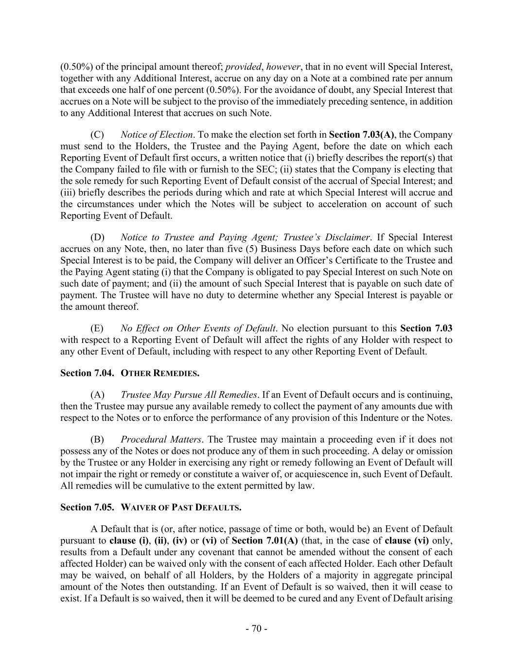 - 70 - (0.50%) of the principal amount thereof; provided, however, that in no event will Special Interest, together with any Additional Interest, accrue on any day on a Note at a combined rate per annum that exceeds one half of one percent (0.50%). For the avoidance of doubt, any Special Interest that accrues on a Note will be subject to the proviso of the immediately preceding sentence, in addition to any Additional Interest that accrues on such Note. (C) Notice of Election. To make the election set forth in Section 7.03(A), the Company must send to the Holders, the Trustee and the Paying Agent, before the date on which each Reporting Event of Default first occurs, a written notice that (i) briefly describes the report(s) that the Company failed to file with or furnish to the SEC; (ii) states that the Company is electing that the sole remedy for such Reporting Event of Default consist of the accrual of Special Interest; and (iii) briefly describes the periods during which and rate at which Special Interest will accrue and the circumstances under which the Notes will be subject to acceleration on account of such Reporting Event of Default. (D) Notice to Trustee and Paying Agent; Trustee’s Disclaimer. If Special Interest accrues on any Note, then, no later than five (5) Business Days before each date on which such Special Interest is to be paid, the Company will deliver an Officer’s Certificate to the Trustee and the Paying Agent stating (i) that the Company is obligated to pay Special Interest on such Note on such date of payment; and (ii) the amount of such Special Interest that is payable on such date of payment. The Trustee will have no duty to determine whether any Special Interest is payable or the amount thereof. (E) No Effect on Other Events of Default. No election pursuant to this Section 7.03 with respect to a Reporting Event of Default will affect the rights of any Holder with respect to any other Event of Default, including with respect to any other Reporting Event of Default. Section 7.04. OTHER REMEDIES. (A) Trustee May Pursue All Remedies. If an Event of Default occurs and is continuing, then the Trustee may pursue any available remedy to collect the payment of any amounts due with respect to the Notes or to enforce the performance of any provision of this Indenture or the Notes. (B) Procedural Matters. The Trustee may maintain a proceeding even if it does not possess any of the Notes or does not produce any of them in such proceeding. A delay or omission by the Trustee or any Holder in exercising any right or remedy following an Event of Default will not impair the right or remedy or constitute a waiver of, or acquiescence in, such Event of Default. All remedies will be cumulative to the extent permitted by law. Section 7.05. WAIVER OF PAST DEFAULTS. A Default that is (or, after notice, passage of time or both, would be) an Event of Default pursuant to clause (i), (ii), (iv) or (vi) of Section 7.01(A) (that, in the case of clause (vi) only, results from a Default under any covenant that cannot be amended without the consent of each affected Holder) can be waived only with the consent of each affected Holder. Each other Default may be waived, on behalf of all Holders, by the Holders of a majority in aggregate principal amount of the Notes then outstanding. If an Event of Default is so waived, then it will cease to exist. If a Default is so waived, then it will be deemed to be cured and any Event of Default arising