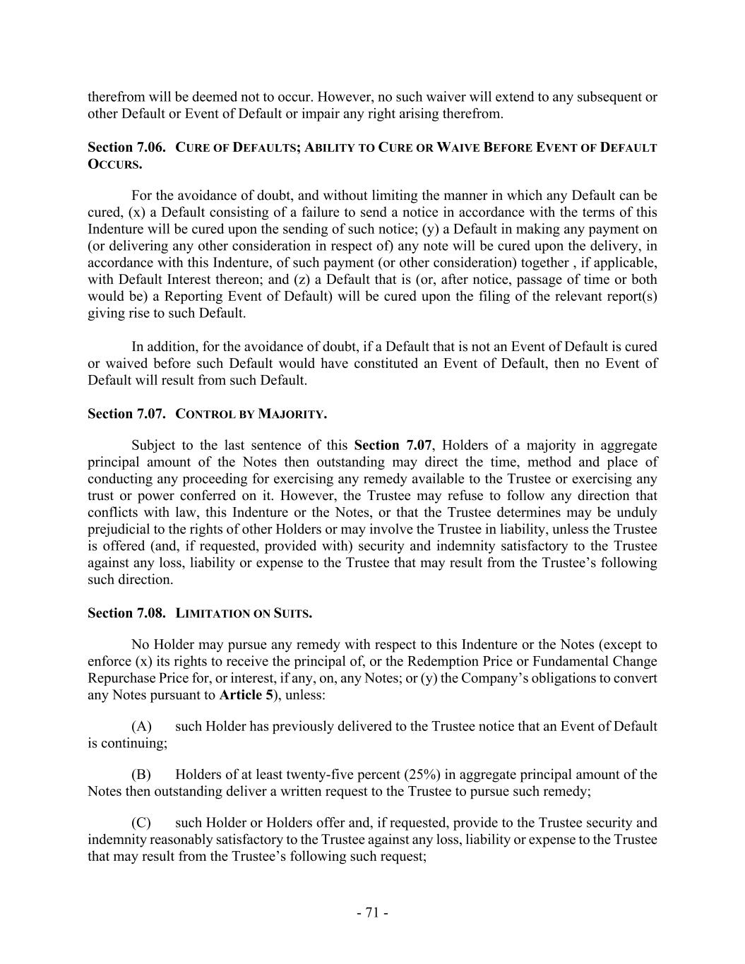 - 71 - therefrom will be deemed not to occur. However, no such waiver will extend to any subsequent or other Default or Event of Default or impair any right arising therefrom. Section 7.06. CURE OF DEFAULTS; ABILITY TO CURE OR WAIVE BEFORE EVENT OF DEFAULT OCCURS. For the avoidance of doubt, and without limiting the manner in which any Default can be cured, (x) a Default consisting of a failure to send a notice in accordance with the terms of this Indenture will be cured upon the sending of such notice; (y) a Default in making any payment on (or delivering any other consideration in respect of) any note will be cured upon the delivery, in accordance with this Indenture, of such payment (or other consideration) together , if applicable, with Default Interest thereon; and (z) a Default that is (or, after notice, passage of time or both would be) a Reporting Event of Default) will be cured upon the filing of the relevant report(s) giving rise to such Default. In addition, for the avoidance of doubt, if a Default that is not an Event of Default is cured or waived before such Default would have constituted an Event of Default, then no Event of Default will result from such Default. Section 7.07. CONTROL BY MAJORITY. Subject to the last sentence of this Section 7.07, Holders of a majority in aggregate principal amount of the Notes then outstanding may direct the time, method and place of conducting any proceeding for exercising any remedy available to the Trustee or exercising any trust or power conferred on it. However, the Trustee may refuse to follow any direction that conflicts with law, this Indenture or the Notes, or that the Trustee determines may be unduly prejudicial to the rights of other Holders or may involve the Trustee in liability, unless the Trustee is offered (and, if requested, provided with) security and indemnity satisfactory to the Trustee against any loss, liability or expense to the Trustee that may result from the Trustee’s following such direction. Section 7.08. LIMITATION ON SUITS. No Holder may pursue any remedy with respect to this Indenture or the Notes (except to enforce (x) its rights to receive the principal of, or the Redemption Price or Fundamental Change Repurchase Price for, or interest, if any, on, any Notes; or (y) the Company’s obligations to convert any Notes pursuant to Article 5), unless: (A) such Holder has previously delivered to the Trustee notice that an Event of Default is continuing; (B) Holders of at least twenty-five percent (25%) in aggregate principal amount of the Notes then outstanding deliver a written request to the Trustee to pursue such remedy; (C) such Holder or Holders offer and, if requested, provide to the Trustee security and indemnity reasonably satisfactory to the Trustee against any loss, liability or expense to the Trustee that may result from the Trustee’s following such request;