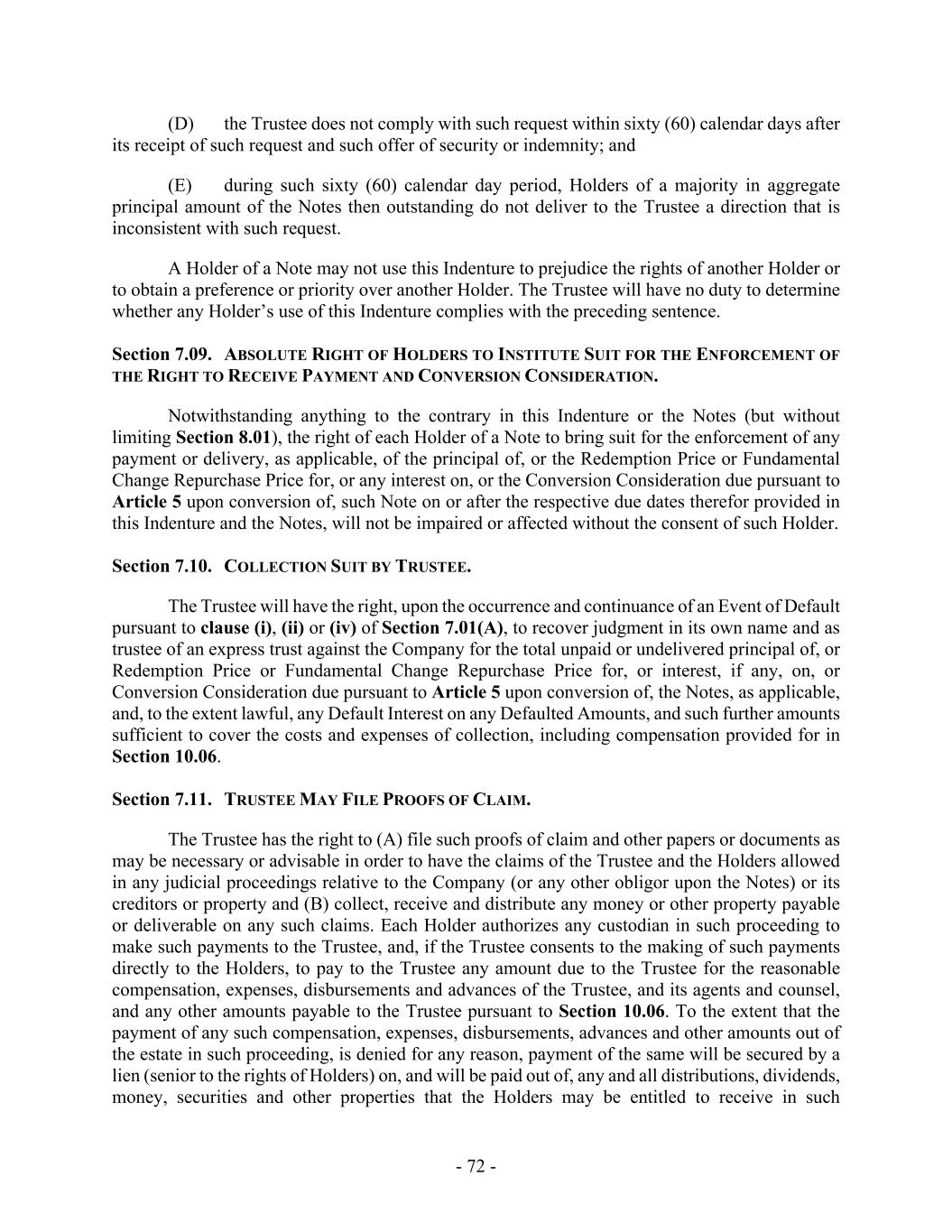 - 72 - (D) the Trustee does not comply with such request within sixty (60) calendar days after its receipt of such request and such offer of security or indemnity; and (E) during such sixty (60) calendar day period, Holders of a majority in aggregate principal amount of the Notes then outstanding do not deliver to the Trustee a direction that is inconsistent with such request. A Holder of a Note may not use this Indenture to prejudice the rights of another Holder or to obtain a preference or priority over another Holder. The Trustee will have no duty to determine whether any Holder’s use of this Indenture complies with the preceding sentence. Section 7.09. ABSOLUTE RIGHT OF HOLDERS TO INSTITUTE SUIT FOR THE ENFORCEMENT OF THE RIGHT TO RECEIVE PAYMENT AND CONVERSION CONSIDERATION. Notwithstanding anything to the contrary in this Indenture or the Notes (but without limiting Section 8.01), the right of each Holder of a Note to bring suit for the enforcement of any payment or delivery, as applicable, of the principal of, or the Redemption Price or Fundamental Change Repurchase Price for, or any interest on, or the Conversion Consideration due pursuant to Article 5 upon conversion of, such Note on or after the respective due dates therefor provided in this Indenture and the Notes, will not be impaired or affected without the consent of such Holder. Section 7.10. COLLECTION SUIT BY TRUSTEE. The Trustee will have the right, upon the occurrence and continuance of an Event of Default pursuant to clause (i), (ii) or (iv) of Section 7.01(A), to recover judgment in its own name and as trustee of an express trust against the Company for the total unpaid or undelivered principal of, or Redemption Price or Fundamental Change Repurchase Price for, or interest, if any, on, or Conversion Consideration due pursuant to Article 5 upon conversion of, the Notes, as applicable, and, to the extent lawful, any Default Interest on any Defaulted Amounts, and such further amounts sufficient to cover the costs and expenses of collection, including compensation provided for in Section 10.06. Section 7.11. TRUSTEE MAY FILE PROOFS OF CLAIM. The Trustee has the right to (A) file such proofs of claim and other papers or documents as may be necessary or advisable in order to have the claims of the Trustee and the Holders allowed in any judicial proceedings relative to the Company (or any other obligor upon the Notes) or its creditors or property and (B) collect, receive and distribute any money or other property payable or deliverable on any such claims. Each Holder authorizes any custodian in such proceeding to make such payments to the Trustee, and, if the Trustee consents to the making of such payments directly to the Holders, to pay to the Trustee any amount due to the Trustee for the reasonable compensation, expenses, disbursements and advances of the Trustee, and its agents and counsel, and any other amounts payable to the Trustee pursuant to Section 10.06. To the extent that the payment of any such compensation, expenses, disbursements, advances and other amounts out of the estate in such proceeding, is denied for any reason, payment of the same will be secured by a lien (senior to the rights of Holders) on, and will be paid out of, any and all distributions, dividends, money, securities and other properties that the Holders may be entitled to receive in such