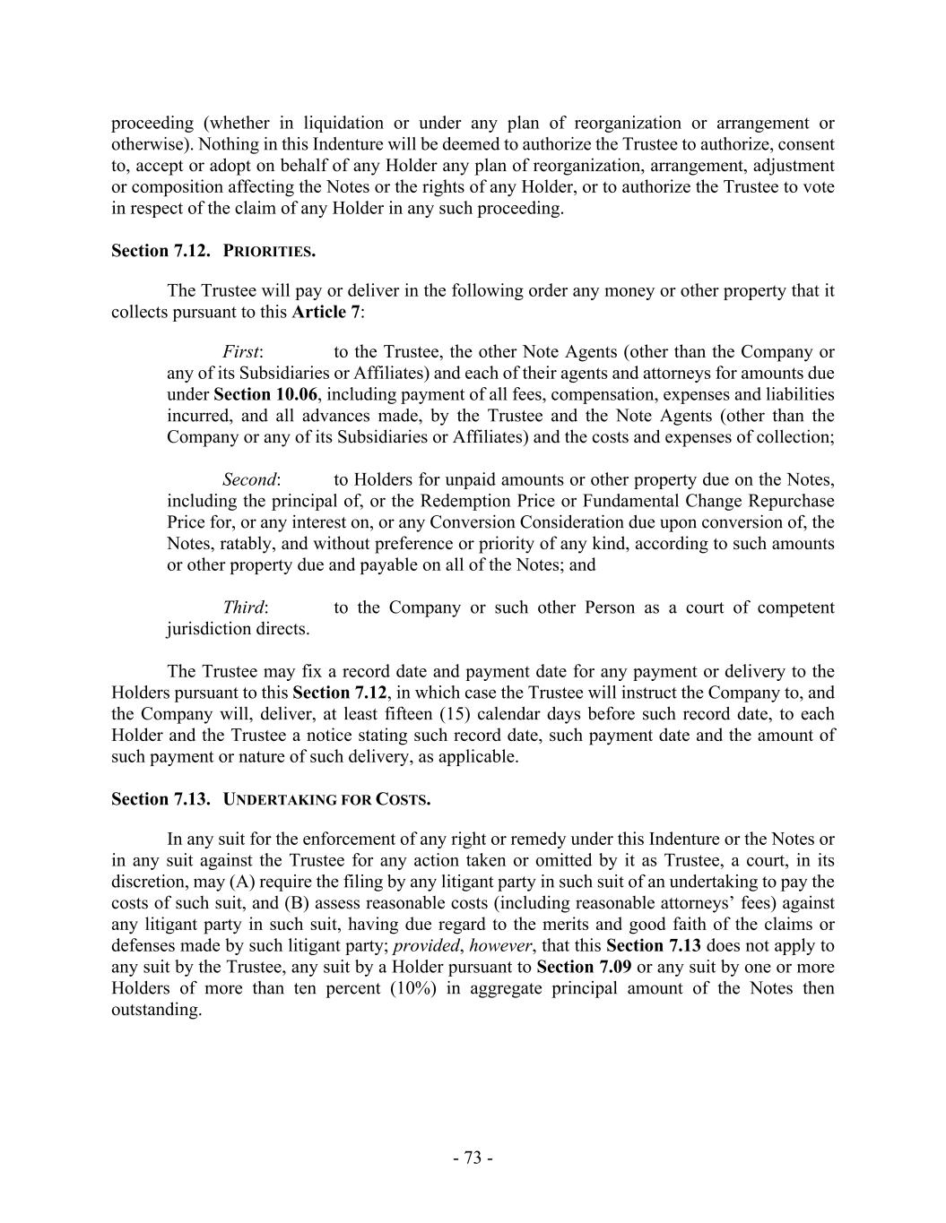 - 73 - proceeding (whether in liquidation or under any plan of reorganization or arrangement or otherwise). Nothing in this Indenture will be deemed to authorize the Trustee to authorize, consent to, accept or adopt on behalf of any Holder any plan of reorganization, arrangement, adjustment or composition affecting the Notes or the rights of any Holder, or to authorize the Trustee to vote in respect of the claim of any Holder in any such proceeding. Section 7.12. PRIORITIES. The Trustee will pay or deliver in the following order any money or other property that it collects pursuant to this Article 7: First: to the Trustee, the other Note Agents (other than the Company or any of its Subsidiaries or Affiliates) and each of their agents and attorneys for amounts due under Section 10.06, including payment of all fees, compensation, expenses and liabilities incurred, and all advances made, by the Trustee and the Note Agents (other than the Company or any of its Subsidiaries or Affiliates) and the costs and expenses of collection; Second: to Holders for unpaid amounts or other property due on the Notes, including the principal of, or the Redemption Price or Fundamental Change Repurchase Price for, or any interest on, or any Conversion Consideration due upon conversion of, the Notes, ratably, and without preference or priority of any kind, according to such amounts or other property due and payable on all of the Notes; and Third: to the Company or such other Person as a court of competent jurisdiction directs. The Trustee may fix a record date and payment date for any payment or delivery to the Holders pursuant to this Section 7.12, in which case the Trustee will instruct the Company to, and the Company will, deliver, at least fifteen (15) calendar days before such record date, to each Holder and the Trustee a notice stating such record date, such payment date and the amount of such payment or nature of such delivery, as applicable. Section 7.13. UNDERTAKING FOR COSTS. In any suit for the enforcement of any right or remedy under this Indenture or the Notes or in any suit against the Trustee for any action taken or omitted by it as Trustee, a court, in its discretion, may (A) require the filing by any litigant party in such suit of an undertaking to pay the costs of such suit, and (B) assess reasonable costs (including reasonable attorneys’ fees) against any litigant party in such suit, having due regard to the merits and good faith of the claims or defenses made by such litigant party; provided, however, that this Section 7.13 does not apply to any suit by the Trustee, any suit by a Holder pursuant to Section 7.09 or any suit by one or more Holders of more than ten percent (10%) in aggregate principal amount of the Notes then outstanding.