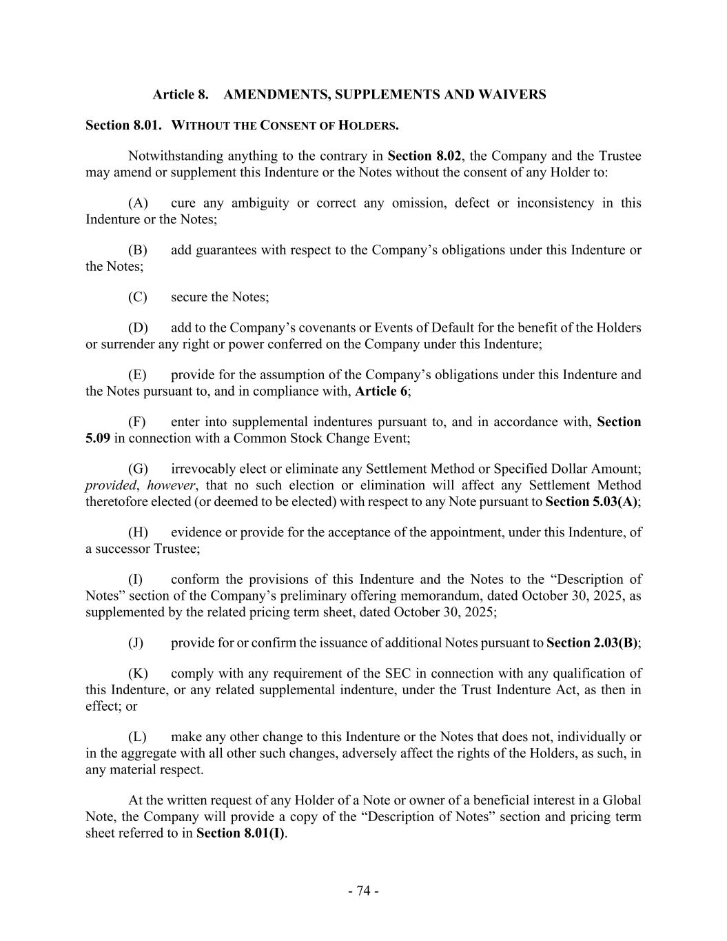- 74 - Article 8. AMENDMENTS, SUPPLEMENTS AND WAIVERS Section 8.01. WITHOUT THE CONSENT OF HOLDERS. Notwithstanding anything to the contrary in Section 8.02, the Company and the Trustee may amend or supplement this Indenture or the Notes without the consent of any Holder to: (A) cure any ambiguity or correct any omission, defect or inconsistency in this Indenture or the Notes; (B) add guarantees with respect to the Company’s obligations under this Indenture or the Notes; (C) secure the Notes; (D) add to the Company’s covenants or Events of Default for the benefit of the Holders or surrender any right or power conferred on the Company under this Indenture; (E) provide for the assumption of the Company’s obligations under this Indenture and the Notes pursuant to, and in compliance with, Article 6; (F) enter into supplemental indentures pursuant to, and in accordance with, Section 5.09 in connection with a Common Stock Change Event; (G) irrevocably elect or eliminate any Settlement Method or Specified Dollar Amount; provided, however, that no such election or elimination will affect any Settlement Method theretofore elected (or deemed to be elected) with respect to any Note pursuant to Section 5.03(A); (H) evidence or provide for the acceptance of the appointment, under this Indenture, of a successor Trustee; (I) conform the provisions of this Indenture and the Notes to the “Description of Notes” section of the Company’s preliminary offering memorandum, dated October 30, 2025, as supplemented by the related pricing term sheet, dated October 30, 2025; (J) provide for or confirm the issuance of additional Notes pursuant to Section 2.03(B); (K) comply with any requirement of the SEC in connection with any qualification of this Indenture, or any related supplemental indenture, under the Trust Indenture Act, as then in effect; or (L) make any other change to this Indenture or the Notes that does not, individually or in the aggregate with all other such changes, adversely affect the rights of the Holders, as such, in any material respect. At the written request of any Holder of a Note or owner of a beneficial interest in a Global Note, the Company will provide a copy of the “Description of Notes” section and pricing term sheet referred to in Section 8.01(I).