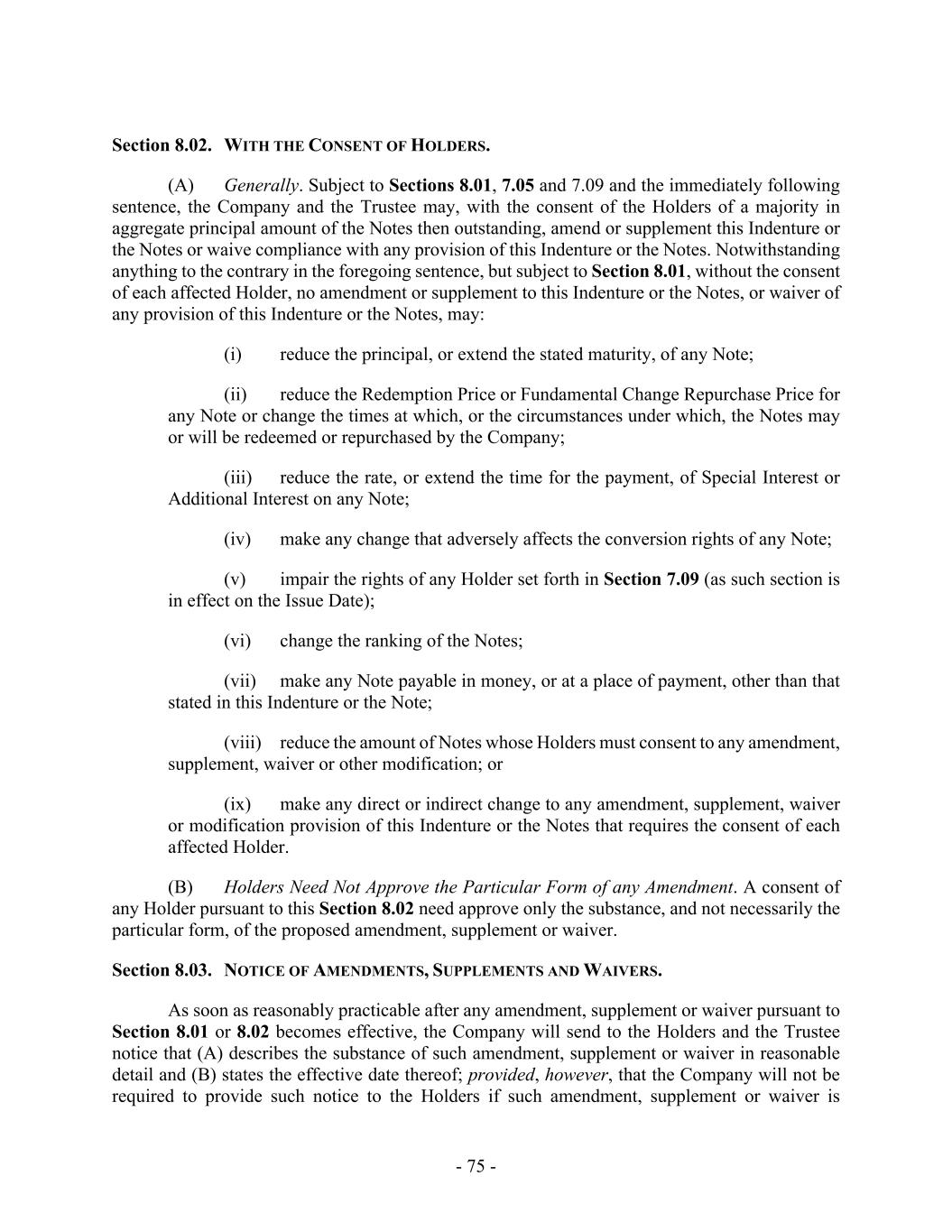 - 75 - Section 8.02. WITH THE CONSENT OF HOLDERS. (A) Generally. Subject to Sections 8.01, 7.05 and 7.09 and the immediately following sentence, the Company and the Trustee may, with the consent of the Holders of a majority in aggregate principal amount of the Notes then outstanding, amend or supplement this Indenture or the Notes or waive compliance with any provision of this Indenture or the Notes. Notwithstanding anything to the contrary in the foregoing sentence, but subject to Section 8.01, without the consent of each affected Holder, no amendment or supplement to this Indenture or the Notes, or waiver of any provision of this Indenture or the Notes, may: (i) reduce the principal, or extend the stated maturity, of any Note; (ii) reduce the Redemption Price or Fundamental Change Repurchase Price for any Note or change the times at which, or the circumstances under which, the Notes may or will be redeemed or repurchased by the Company; (iii) reduce the rate, or extend the time for the payment, of Special Interest or Additional Interest on any Note; (iv) make any change that adversely affects the conversion rights of any Note; (v) impair the rights of any Holder set forth in Section 7.09 (as such section is in effect on the Issue Date); (vi) change the ranking of the Notes; (vii) make any Note payable in money, or at a place of payment, other than that stated in this Indenture or the Note; (viii) reduce the amount of Notes whose Holders must consent to any amendment, supplement, waiver or other modification; or (ix) make any direct or indirect change to any amendment, supplement, waiver or modification provision of this Indenture or the Notes that requires the consent of each affected Holder. (B) Holders Need Not Approve the Particular Form of any Amendment. A consent of any Holder pursuant to this Section 8.02 need approve only the substance, and not necessarily the particular form, of the proposed amendment, supplement or waiver. Section 8.03. NOTICE OF AMENDMENTS, SUPPLEMENTS AND WAIVERS. As soon as reasonably practicable after any amendment, supplement or waiver pursuant to Section 8.01 or 8.02 becomes effective, the Company will send to the Holders and the Trustee notice that (A) describes the substance of such amendment, supplement or waiver in reasonable detail and (B) states the effective date thereof; provided, however, that the Company will not be required to provide such notice to the Holders if such amendment, supplement or waiver is