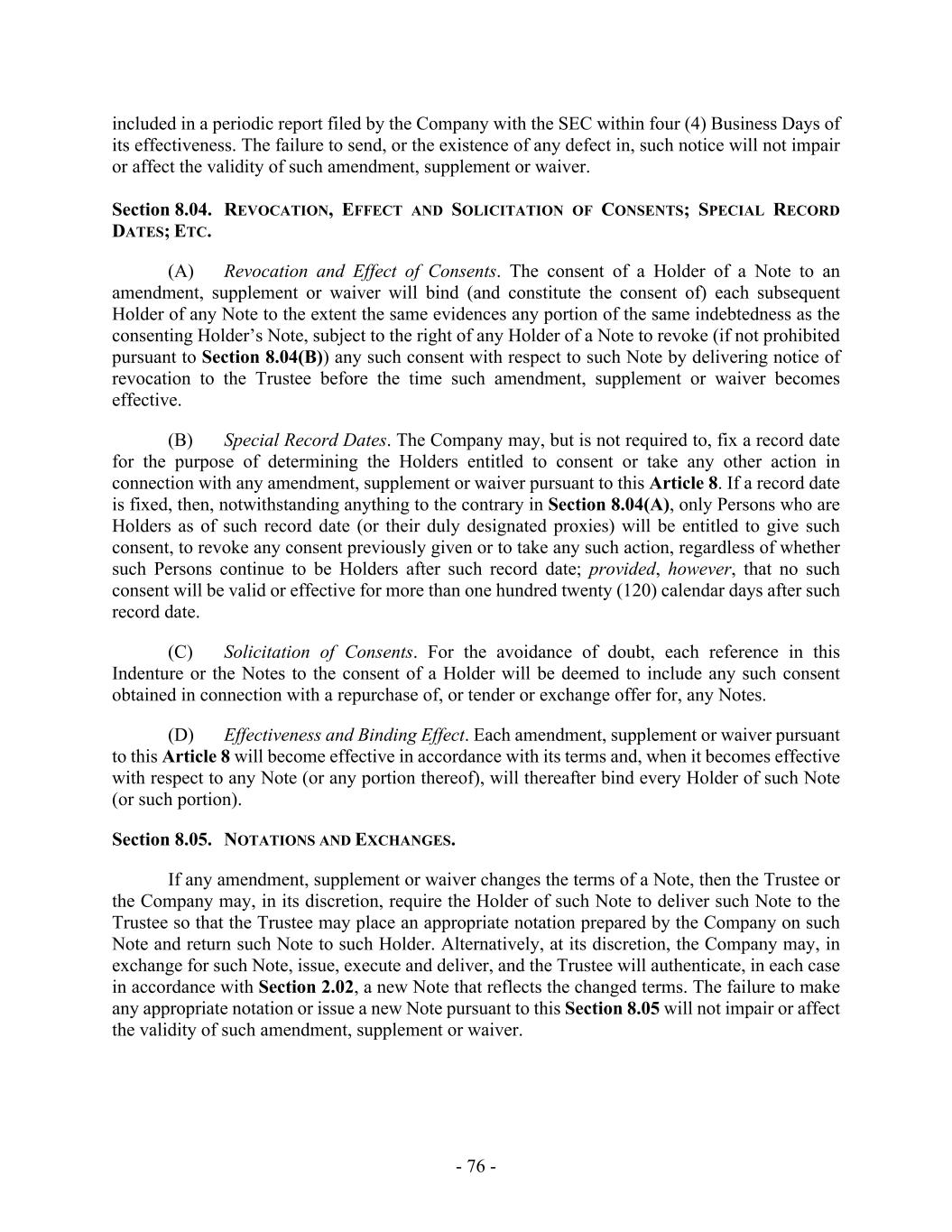 - 76 - included in a periodic report filed by the Company with the SEC within four (4) Business Days of its effectiveness. The failure to send, or the existence of any defect in, such notice will not impair or affect the validity of such amendment, supplement or waiver. Section 8.04. REVOCATION, EFFECT AND SOLICITATION OF CONSENTS; SPECIAL RECORD DATES; ETC. (A) Revocation and Effect of Consents. The consent of a Holder of a Note to an amendment, supplement or waiver will bind (and constitute the consent of) each subsequent Holder of any Note to the extent the same evidences any portion of the same indebtedness as the consenting Holder’s Note, subject to the right of any Holder of a Note to revoke (if not prohibited pursuant to Section 8.04(B)) any such consent with respect to such Note by delivering notice of revocation to the Trustee before the time such amendment, supplement or waiver becomes effective. (B) Special Record Dates. The Company may, but is not required to, fix a record date for the purpose of determining the Holders entitled to consent or take any other action in connection with any amendment, supplement or waiver pursuant to this Article 8. If a record date is fixed, then, notwithstanding anything to the contrary in Section 8.04(A), only Persons who are Holders as of such record date (or their duly designated proxies) will be entitled to give such consent, to revoke any consent previously given or to take any such action, regardless of whether such Persons continue to be Holders after such record date; provided, however, that no such consent will be valid or effective for more than one hundred twenty (120) calendar days after such record date. (C) Solicitation of Consents. For the avoidance of doubt, each reference in this Indenture or the Notes to the consent of a Holder will be deemed to include any such consent obtained in connection with a repurchase of, or tender or exchange offer for, any Notes. (D) Effectiveness and Binding Effect. Each amendment, supplement or waiver pursuant to this Article 8 will become effective in accordance with its terms and, when it becomes effective with respect to any Note (or any portion thereof), will thereafter bind every Holder of such Note (or such portion). Section 8.05. NOTATIONS AND EXCHANGES. If any amendment, supplement or waiver changes the terms of a Note, then the Trustee or the Company may, in its discretion, require the Holder of such Note to deliver such Note to the Trustee so that the Trustee may place an appropriate notation prepared by the Company on such Note and return such Note to such Holder. Alternatively, at its discretion, the Company may, in exchange for such Note, issue, execute and deliver, and the Trustee will authenticate, in each case in accordance with Section 2.02, a new Note that reflects the changed terms. The failure to make any appropriate notation or issue a new Note pursuant to this Section 8.05 will not impair or affect the validity of such amendment, supplement or waiver.