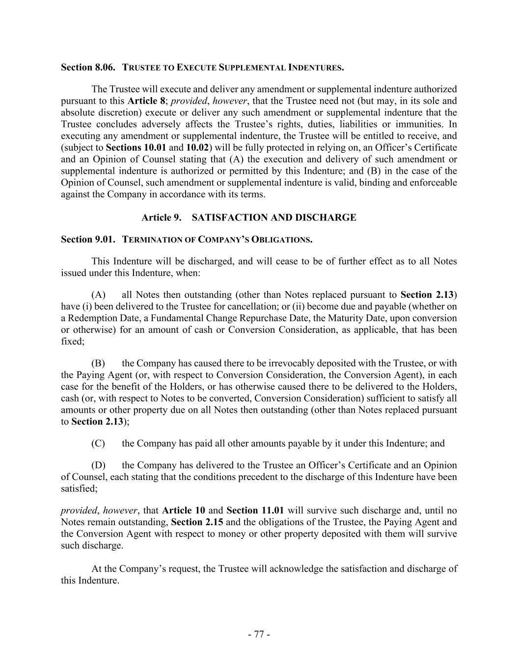 - 77 - Section 8.06. TRUSTEE TO EXECUTE SUPPLEMENTAL INDENTURES. The Trustee will execute and deliver any amendment or supplemental indenture authorized pursuant to this Article 8; provided, however, that the Trustee need not (but may, in its sole and absolute discretion) execute or deliver any such amendment or supplemental indenture that the Trustee concludes adversely affects the Trustee’s rights, duties, liabilities or immunities. In executing any amendment or supplemental indenture, the Trustee will be entitled to receive, and (subject to Sections 10.01 and 10.02) will be fully protected in relying on, an Officer’s Certificate and an Opinion of Counsel stating that (A) the execution and delivery of such amendment or supplemental indenture is authorized or permitted by this Indenture; and (B) in the case of the Opinion of Counsel, such amendment or supplemental indenture is valid, binding and enforceable against the Company in accordance with its terms. Article 9. SATISFACTION AND DISCHARGE Section 9.01. TERMINATION OF COMPANY’S OBLIGATIONS. This Indenture will be discharged, and will cease to be of further effect as to all Notes issued under this Indenture, when: (A) all Notes then outstanding (other than Notes replaced pursuant to Section 2.13) have (i) been delivered to the Trustee for cancellation; or (ii) become due and payable (whether on a Redemption Date, a Fundamental Change Repurchase Date, the Maturity Date, upon conversion or otherwise) for an amount of cash or Conversion Consideration, as applicable, that has been fixed; (B) the Company has caused there to be irrevocably deposited with the Trustee, or with the Paying Agent (or, with respect to Conversion Consideration, the Conversion Agent), in each case for the benefit of the Holders, or has otherwise caused there to be delivered to the Holders, cash (or, with respect to Notes to be converted, Conversion Consideration) sufficient to satisfy all amounts or other property due on all Notes then outstanding (other than Notes replaced pursuant to Section 2.13); (C) the Company has paid all other amounts payable by it under this Indenture; and (D) the Company has delivered to the Trustee an Officer’s Certificate and an Opinion of Counsel, each stating that the conditions precedent to the discharge of this Indenture have been satisfied; provided, however, that Article 10 and Section 11.01 will survive such discharge and, until no Notes remain outstanding, Section 2.15 and the obligations of the Trustee, the Paying Agent and the Conversion Agent with respect to money or other property deposited with them will survive such discharge. At the Company’s request, the Trustee will acknowledge the satisfaction and discharge of this Indenture.