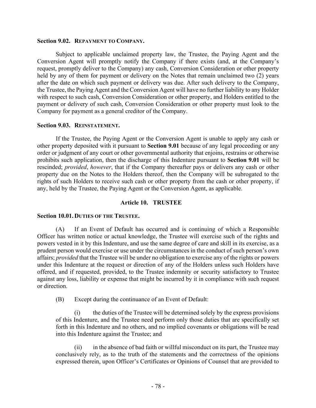- 78 - Section 9.02. REPAYMENT TO COMPANY. Subject to applicable unclaimed property law, the Trustee, the Paying Agent and the Conversion Agent will promptly notify the Company if there exists (and, at the Company’s request, promptly deliver to the Company) any cash, Conversion Consideration or other property held by any of them for payment or delivery on the Notes that remain unclaimed two (2) years after the date on which such payment or delivery was due. After such delivery to the Company, the Trustee, the Paying Agent and the Conversion Agent will have no further liability to any Holder with respect to such cash, Conversion Consideration or other property, and Holders entitled to the payment or delivery of such cash, Conversion Consideration or other property must look to the Company for payment as a general creditor of the Company. Section 9.03. REINSTATEMENT. If the Trustee, the Paying Agent or the Conversion Agent is unable to apply any cash or other property deposited with it pursuant to Section 9.01 because of any legal proceeding or any order or judgment of any court or other governmental authority that enjoins, restrains or otherwise prohibits such application, then the discharge of this Indenture pursuant to Section 9.01 will be rescinded; provided, however, that if the Company thereafter pays or delivers any cash or other property due on the Notes to the Holders thereof, then the Company will be subrogated to the rights of such Holders to receive such cash or other property from the cash or other property, if any, held by the Trustee, the Paying Agent or the Conversion Agent, as applicable. Article 10. TRUSTEE Section 10.01. DUTIES OF THE TRUSTEE. (A) If an Event of Default has occurred and is continuing of which a Responsible Officer has written notice or actual knowledge, the Trustee will exercise such of the rights and powers vested in it by this Indenture, and use the same degree of care and skill in its exercise, as a prudent person would exercise or use under the circumstances in the conduct of such person’s own affairs; provided that the Trustee will be under no obligation to exercise any of the rights or powers under this Indenture at the request or direction of any of the Holders unless such Holders have offered, and if requested, provided, to the Trustee indemnity or security satisfactory to Trustee against any loss, liability or expense that might be incurred by it in compliance with such request or direction. (B) Except during the continuance of an Event of Default: (i) the duties of the Trustee will be determined solely by the express provisions of this Indenture, and the Trustee need perform only those duties that are specifically set forth in this Indenture and no others, and no implied covenants or obligations will be read into this Indenture against the Trustee; and (ii) in the absence of bad faith or willful misconduct on its part, the Trustee may conclusively rely, as to the truth of the statements and the correctness of the opinions expressed therein, upon Officer’s Certificates or Opinions of Counsel that are provided to