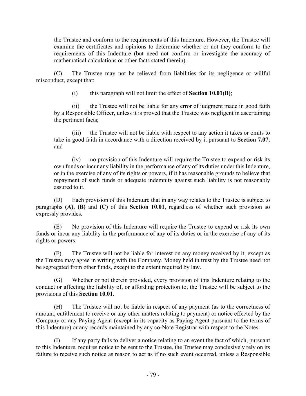 - 79 - the Trustee and conform to the requirements of this Indenture. However, the Trustee will examine the certificates and opinions to determine whether or not they conform to the requirements of this Indenture (but need not confirm or investigate the accuracy of mathematical calculations or other facts stated therein). (C) The Trustee may not be relieved from liabilities for its negligence or willful misconduct, except that: (i) this paragraph will not limit the effect of Section 10.01(B); (ii) the Trustee will not be liable for any error of judgment made in good faith by a Responsible Officer, unless it is proved that the Trustee was negligent in ascertaining the pertinent facts; (iii) the Trustee will not be liable with respect to any action it takes or omits to take in good faith in accordance with a direction received by it pursuant to Section 7.07; and (iv) no provision of this Indenture will require the Trustee to expend or risk its own funds or incur any liability in the performance of any of its duties under this Indenture, or in the exercise of any of its rights or powers, if it has reasonable grounds to believe that repayment of such funds or adequate indemnity against such liability is not reasonably assured to it. (D) Each provision of this Indenture that in any way relates to the Trustee is subject to paragraphs (A), (B) and (C) of this Section 10.01, regardless of whether such provision so expressly provides. (E) No provision of this Indenture will require the Trustee to expend or risk its own funds or incur any liability in the performance of any of its duties or in the exercise of any of its rights or powers. (F) The Trustee will not be liable for interest on any money received by it, except as the Trustee may agree in writing with the Company. Money held in trust by the Trustee need not be segregated from other funds, except to the extent required by law. (G) Whether or not therein provided, every provision of this Indenture relating to the conduct or affecting the liability of, or affording protection to, the Trustee will be subject to the provisions of this Section 10.01. (H) The Trustee will not be liable in respect of any payment (as to the correctness of amount, entitlement to receive or any other matters relating to payment) or notice effected by the Company or any Paying Agent (except in its capacity as Paying Agent pursuant to the terms of this Indenture) or any records maintained by any co-Note Registrar with respect to the Notes. (I) If any party fails to deliver a notice relating to an event the fact of which, pursuant to this Indenture, requires notice to be sent to the Trustee, the Trustee may conclusively rely on its failure to receive such notice as reason to act as if no such event occurred, unless a Responsible