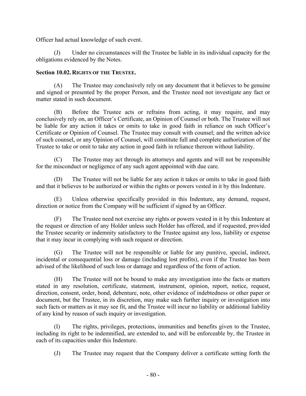 - 80 - Officer had actual knowledge of such event. (J) Under no circumstances will the Trustee be liable in its individual capacity for the obligations evidenced by the Notes. Section 10.02. RIGHTS OF THE TRUSTEE. (A) The Trustee may conclusively rely on any document that it believes to be genuine and signed or presented by the proper Person, and the Trustee need not investigate any fact or matter stated in such document. (B) Before the Trustee acts or refrains from acting, it may require, and may conclusively rely on, an Officer’s Certificate, an Opinion of Counsel or both. The Trustee will not be liable for any action it takes or omits to take in good faith in reliance on such Officer’s Certificate or Opinion of Counsel. The Trustee may consult with counsel; and the written advice of such counsel, or any Opinion of Counsel, will constitute full and complete authorization of the Trustee to take or omit to take any action in good faith in reliance thereon without liability. (C) The Trustee may act through its attorneys and agents and will not be responsible for the misconduct or negligence of any such agent appointed with due care. (D) The Trustee will not be liable for any action it takes or omits to take in good faith and that it believes to be authorized or within the rights or powers vested in it by this Indenture. (E) Unless otherwise specifically provided in this Indenture, any demand, request, direction or notice from the Company will be sufficient if signed by an Officer. (F) The Trustee need not exercise any rights or powers vested in it by this Indenture at the request or direction of any Holder unless such Holder has offered, and if requested, provided the Trustee security or indemnity satisfactory to the Trustee against any loss, liability or expense that it may incur in complying with such request or direction. (G) The Trustee will not be responsible or liable for any punitive, special, indirect, incidental or consequential loss or damage (including lost profits), even if the Trustee has been advised of the likelihood of such loss or damage and regardless of the form of action. (H) The Trustee will not be bound to make any investigation into the facts or matters stated in any resolution, certificate, statement, instrument, opinion, report, notice, request, direction, consent, order, bond, debenture, note, other evidence of indebtedness or other paper or document, but the Trustee, in its discretion, may make such further inquiry or investigation into such facts or matters as it may see fit, and the Trustee will incur no liability or additional liability of any kind by reason of such inquiry or investigation. (I) The rights, privileges, protections, immunities and benefits given to the Trustee, including its right to be indemnified, are extended to, and will be enforceable by, the Trustee in each of its capacities under this Indenture. (J) The Trustee may request that the Company deliver a certificate setting forth the