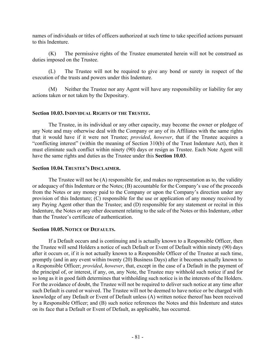 - 81 - names of individuals or titles of officers authorized at such time to take specified actions pursuant to this Indenture. (K) The permissive rights of the Trustee enumerated herein will not be construed as duties imposed on the Trustee. (L) The Trustee will not be required to give any bond or surety in respect of the execution of the trusts and powers under this Indenture. (M) Neither the Trustee nor any Agent will have any responsibility or liability for any actions taken or not taken by the Depositary. Section 10.03. INDIVIDUAL RIGHTS OF THE TRUSTEE. The Trustee, in its individual or any other capacity, may become the owner or pledgee of any Note and may otherwise deal with the Company or any of its Affiliates with the same rights that it would have if it were not Trustee; provided, however, that if the Trustee acquires a “conflicting interest” (within the meaning of Section 310(b) of the Trust Indenture Act), then it must eliminate such conflict within ninety (90) days or resign as Trustee. Each Note Agent will have the same rights and duties as the Trustee under this Section 10.03. Section 10.04. TRUSTEE’S DISCLAIMER. The Trustee will not be (A) responsible for, and makes no representation as to, the validity or adequacy of this Indenture or the Notes; (B) accountable for the Company’s use of the proceeds from the Notes or any money paid to the Company or upon the Company’s direction under any provision of this Indenture; (C) responsible for the use or application of any money received by any Paying Agent other than the Trustee; and (D) responsible for any statement or recital in this Indenture, the Notes or any other document relating to the sale of the Notes or this Indenture, other than the Trustee’s certificate of authentication. Section 10.05. NOTICE OF DEFAULTS. If a Default occurs and is continuing and is actually known to a Responsible Officer, then the Trustee will send Holders a notice of such Default or Event of Default within ninety (90) days after it occurs or, if it is not actually known to a Responsible Officer of the Trustee at such time, promptly (and in any event within twenty (20) Business Days) after it becomes actually known to a Responsible Officer; provided, however, that, except in the case of a Default in the payment of the principal of, or interest, if any, on, any Note, the Trustee may withhold such notice if and for so long as it in good faith determines that withholding such notice is in the interests of the Holders. For the avoidance of doubt, the Trustee will not be required to deliver such notice at any time after such Default is cured or waived. The Trustee will not be deemed to have notice or be charged with knowledge of any Default or Event of Default unless (A) written notice thereof has been received by a Responsible Officer; and (B) such notice references the Notes and this Indenture and states on its face that a Default or Event of Default, as applicable, has occurred.
