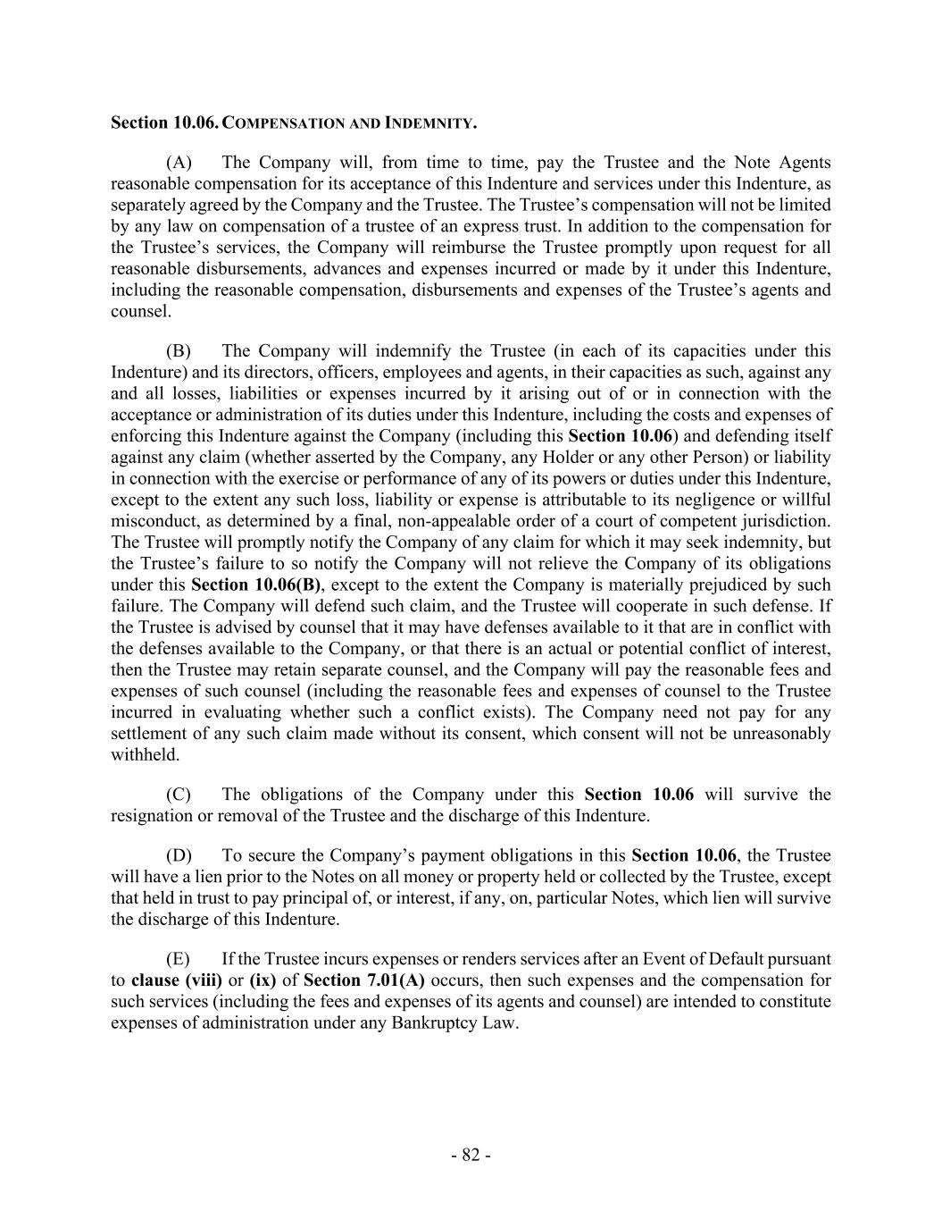 - 82 - Section 10.06. COMPENSATION AND INDEMNITY. (A) The Company will, from time to time, pay the Trustee and the Note Agents reasonable compensation for its acceptance of this Indenture and services under this Indenture, as separately agreed by the Company and the Trustee. The Trustee’s compensation will not be limited by any law on compensation of a trustee of an express trust. In addition to the compensation for the Trustee’s services, the Company will reimburse the Trustee promptly upon request for all reasonable disbursements, advances and expenses incurred or made by it under this Indenture, including the reasonable compensation, disbursements and expenses of the Trustee’s agents and counsel. (B) The Company will indemnify the Trustee (in each of its capacities under this Indenture) and its directors, officers, employees and agents, in their capacities as such, against any and all losses, liabilities or expenses incurred by it arising out of or in connection with the acceptance or administration of its duties under this Indenture, including the costs and expenses of enforcing this Indenture against the Company (including this Section 10.06) and defending itself against any claim (whether asserted by the Company, any Holder or any other Person) or liability in connection with the exercise or performance of any of its powers or duties under this Indenture, except to the extent any such loss, liability or expense is attributable to its negligence or willful misconduct, as determined by a final, non-appealable order of a court of competent jurisdiction. The Trustee will promptly notify the Company of any claim for which it may seek indemnity, but the Trustee’s failure to so notify the Company will not relieve the Company of its obligations under this Section 10.06(B), except to the extent the Company is materially prejudiced by such failure. The Company will defend such claim, and the Trustee will cooperate in such defense. If the Trustee is advised by counsel that it may have defenses available to it that are in conflict with the defenses available to the Company, or that there is an actual or potential conflict of interest, then the Trustee may retain separate counsel, and the Company will pay the reasonable fees and expenses of such counsel (including the reasonable fees and expenses of counsel to the Trustee incurred in evaluating whether such a conflict exists). The Company need not pay for any settlement of any such claim made without its consent, which consent will not be unreasonably withheld. (C) The obligations of the Company under this Section 10.06 will survive the resignation or removal of the Trustee and the discharge of this Indenture. (D) To secure the Company’s payment obligations in this Section 10.06, the Trustee will have a lien prior to the Notes on all money or property held or collected by the Trustee, except that held in trust to pay principal of, or interest, if any, on, particular Notes, which lien will survive the discharge of this Indenture. (E) If the Trustee incurs expenses or renders services after an Event of Default pursuant to clause (viii) or (ix) of Section 7.01(A) occurs, then such expenses and the compensation for such services (including the fees and expenses of its agents and counsel) are intended to constitute expenses of administration under any Bankruptcy Law.