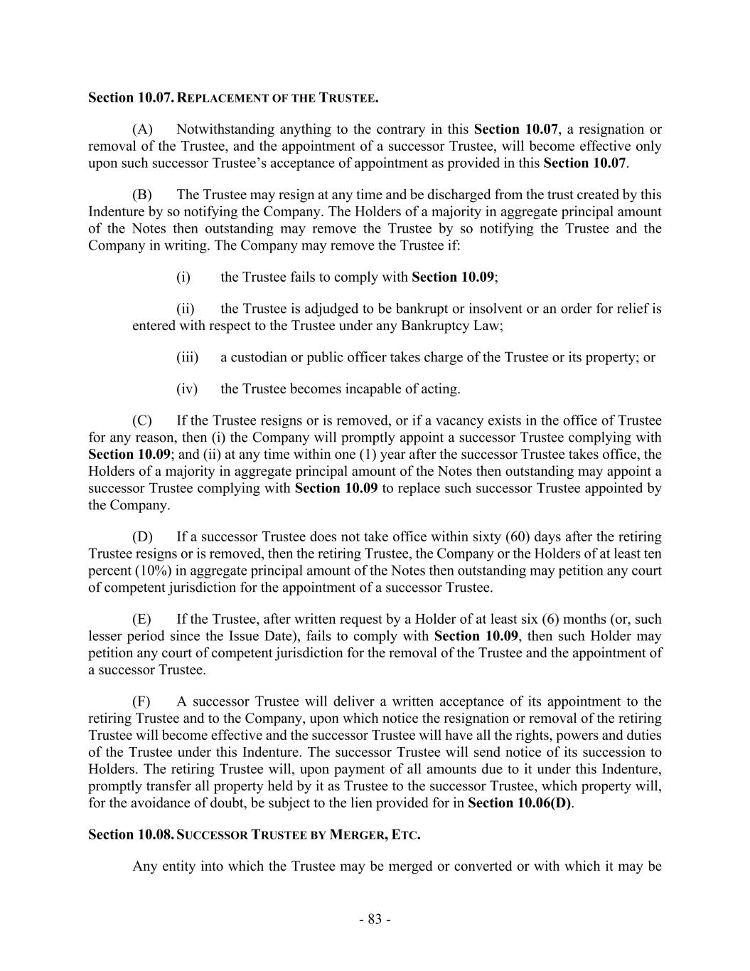 - 83 - Section 10.07. REPLACEMENT OF THE TRUSTEE. (A) Notwithstanding anything to the contrary in this Section 10.07, a resignation or removal of the Trustee, and the appointment of a successor Trustee, will become effective only upon such successor Trustee’s acceptance of appointment as provided in this Section 10.07. (B) The Trustee may resign at any time and be discharged from the trust created by this Indenture by so notifying the Company. The Holders of a majority in aggregate principal amount of the Notes then outstanding may remove the Trustee by so notifying the Trustee and the Company in writing. The Company may remove the Trustee if: (i) the Trustee fails to comply with Section 10.09; (ii) the Trustee is adjudged to be bankrupt or insolvent or an order for relief is entered with respect to the Trustee under any Bankruptcy Law; (iii) a custodian or public officer takes charge of the Trustee or its property; or (iv) the Trustee becomes incapable of acting. (C) If the Trustee resigns or is removed, or if a vacancy exists in the office of Trustee for any reason, then (i) the Company will promptly appoint a successor Trustee complying with Section 10.09; and (ii) at any time within one (1) year after the successor Trustee takes office, the Holders of a majority in aggregate principal amount of the Notes then outstanding may appoint a successor Trustee complying with Section 10.09 to replace such successor Trustee appointed by the Company. (D) If a successor Trustee does not take office within sixty (60) days after the retiring Trustee resigns or is removed, then the retiring Trustee, the Company or the Holders of at least ten percent (10%) in aggregate principal amount of the Notes then outstanding may petition any court of competent jurisdiction for the appointment of a successor Trustee. (E) If the Trustee, after written request by a Holder of at least six (6) months (or, such lesser period since the Issue Date), fails to comply with Section 10.09, then such Holder may petition any court of competent jurisdiction for the removal of the Trustee and the appointment of a successor Trustee. (F) A successor Trustee will deliver a written acceptance of its appointment to the retiring Trustee and to the Company, upon which notice the resignation or removal of the retiring Trustee will become effective and the successor Trustee will have all the rights, powers and duties of the Trustee under this Indenture. The successor Trustee will send notice of its succession to Holders. The retiring Trustee will, upon payment of all amounts due to it under this Indenture, promptly transfer all property held by it as Trustee to the successor Trustee, which property will, for the avoidance of doubt, be subject to the lien provided for in Section 10.06(D). Section 10.08. SUCCESSOR TRUSTEE BY MERGER, ETC. Any entity into which the Trustee may be merged or converted or with which it may be