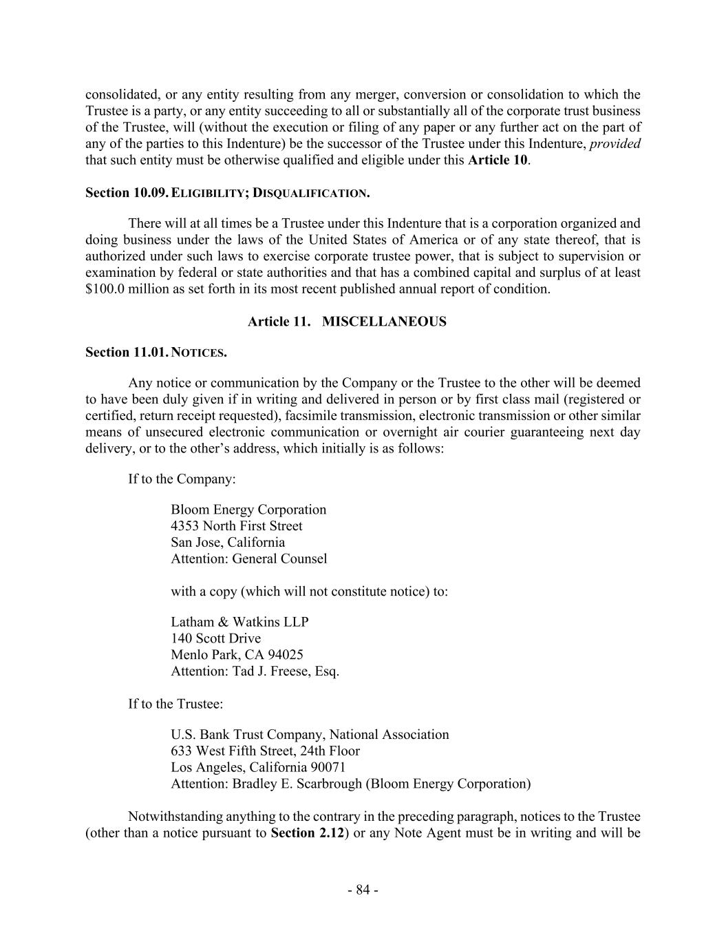 - 84 - consolidated, or any entity resulting from any merger, conversion or consolidation to which the Trustee is a party, or any entity succeeding to all or substantially all of the corporate trust business of the Trustee, will (without the execution or filing of any paper or any further act on the part of any of the parties to this Indenture) be the successor of the Trustee under this Indenture, provided that such entity must be otherwise qualified and eligible under this Article 10. Section 10.09. ELIGIBILITY; DISQUALIFICATION. There will at all times be a Trustee under this Indenture that is a corporation organized and doing business under the laws of the United States of America or of any state thereof, that is authorized under such laws to exercise corporate trustee power, that is subject to supervision or examination by federal or state authorities and that has a combined capital and surplus of at least $100.0 million as set forth in its most recent published annual report of condition. Article 11. MISCELLANEOUS Section 11.01. NOTICES. Any notice or communication by the Company or the Trustee to the other will be deemed to have been duly given if in writing and delivered in person or by first class mail (registered or certified, return receipt requested), facsimile transmission, electronic transmission or other similar means of unsecured electronic communication or overnight air courier guaranteeing next day delivery, or to the other’s address, which initially is as follows: If to the Company: Bloom Energy Corporation 4353 North First Street San Jose, California Attention: General Counsel with a copy (which will not constitute notice) to: Latham & Watkins LLP 140 Scott Drive Menlo Park, CA 94025 Attention: Tad J. Freese, Esq. If to the Trustee: U.S. Bank Trust Company, National Association 633 West Fifth Street, 24th Floor Los Angeles, California 90071 Attention: Bradley E. Scarbrough (Bloom Energy Corporation) Notwithstanding anything to the contrary in the preceding paragraph, notices to the Trustee (other than a notice pursuant to Section 2.12) or any Note Agent must be in writing and will be