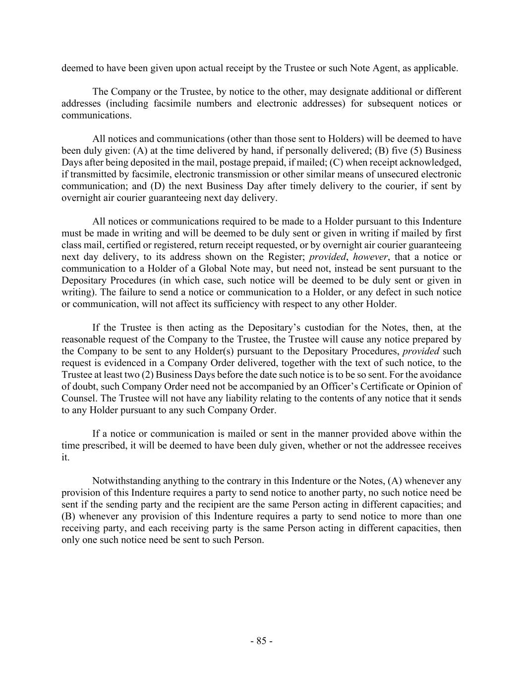 - 85 - deemed to have been given upon actual receipt by the Trustee or such Note Agent, as applicable. The Company or the Trustee, by notice to the other, may designate additional or different addresses (including facsimile numbers and electronic addresses) for subsequent notices or communications. All notices and communications (other than those sent to Holders) will be deemed to have been duly given: (A) at the time delivered by hand, if personally delivered; (B) five (5) Business Days after being deposited in the mail, postage prepaid, if mailed; (C) when receipt acknowledged, if transmitted by facsimile, electronic transmission or other similar means of unsecured electronic communication; and (D) the next Business Day after timely delivery to the courier, if sent by overnight air courier guaranteeing next day delivery. All notices or communications required to be made to a Holder pursuant to this Indenture must be made in writing and will be deemed to be duly sent or given in writing if mailed by first class mail, certified or registered, return receipt requested, or by overnight air courier guaranteeing next day delivery, to its address shown on the Register; provided, however, that a notice or communication to a Holder of a Global Note may, but need not, instead be sent pursuant to the Depositary Procedures (in which case, such notice will be deemed to be duly sent or given in writing). The failure to send a notice or communication to a Holder, or any defect in such notice or communication, will not affect its sufficiency with respect to any other Holder. If the Trustee is then acting as the Depositary’s custodian for the Notes, then, at the reasonable request of the Company to the Trustee, the Trustee will cause any notice prepared by the Company to be sent to any Holder(s) pursuant to the Depositary Procedures, provided such request is evidenced in a Company Order delivered, together with the text of such notice, to the Trustee at least two (2) Business Days before the date such notice is to be so sent. For the avoidance of doubt, such Company Order need not be accompanied by an Officer’s Certificate or Opinion of Counsel. The Trustee will not have any liability relating to the contents of any notice that it sends to any Holder pursuant to any such Company Order. If a notice or communication is mailed or sent in the manner provided above within the time prescribed, it will be deemed to have been duly given, whether or not the addressee receives it. Notwithstanding anything to the contrary in this Indenture or the Notes, (A) whenever any provision of this Indenture requires a party to send notice to another party, no such notice need be sent if the sending party and the recipient are the same Person acting in different capacities; and (B) whenever any provision of this Indenture requires a party to send notice to more than one receiving party, and each receiving party is the same Person acting in different capacities, then only one such notice need be sent to such Person.