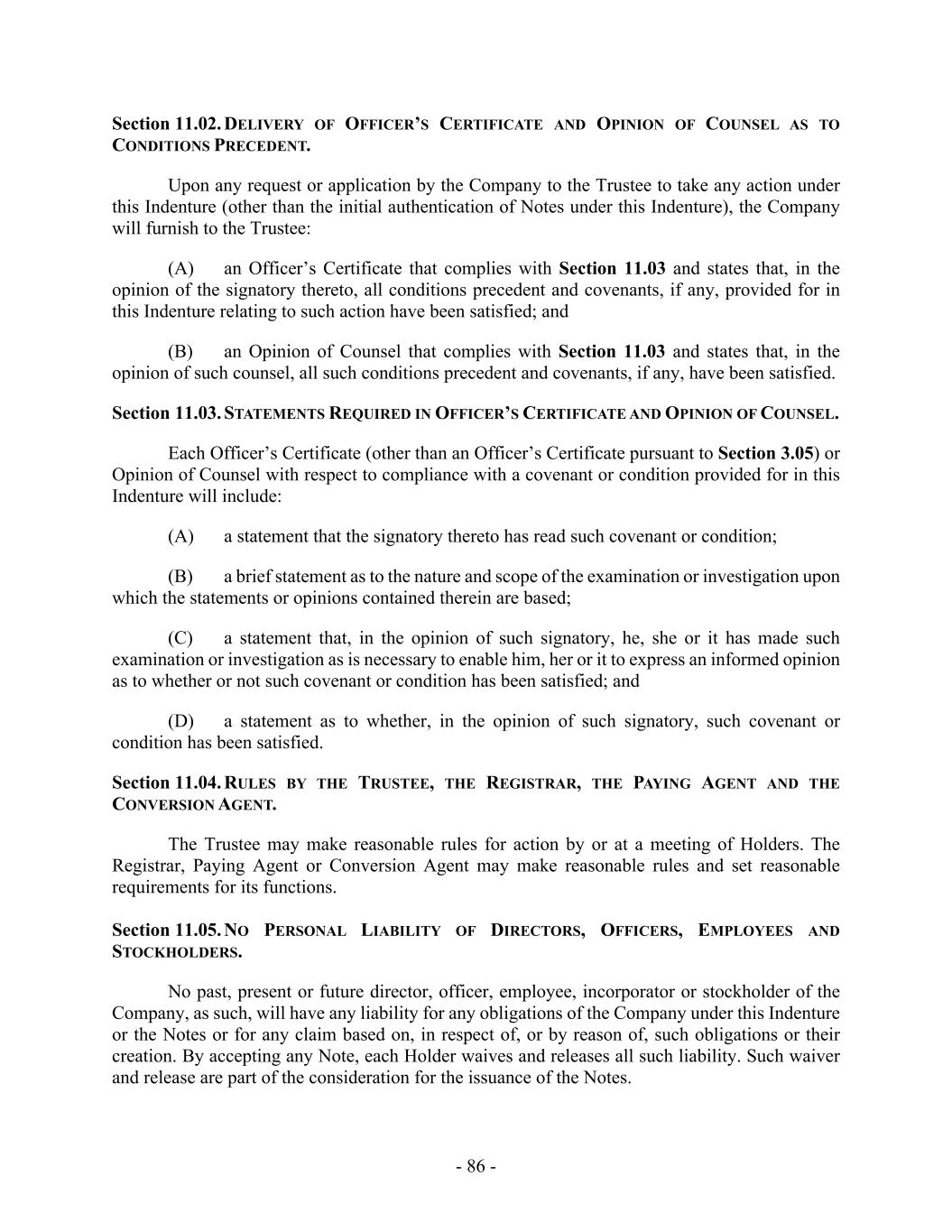 - 86 - Section 11.02. DELIVERY OF OFFICER’S CERTIFICATE AND OPINION OF COUNSEL AS TO CONDITIONS PRECEDENT. Upon any request or application by the Company to the Trustee to take any action under this Indenture (other than the initial authentication of Notes under this Indenture), the Company will furnish to the Trustee: (A) an Officer’s Certificate that complies with Section 11.03 and states that, in the opinion of the signatory thereto, all conditions precedent and covenants, if any, provided for in this Indenture relating to such action have been satisfied; and (B) an Opinion of Counsel that complies with Section 11.03 and states that, in the opinion of such counsel, all such conditions precedent and covenants, if any, have been satisfied. Section 11.03. STATEMENTS REQUIRED IN OFFICER’S CERTIFICATE AND OPINION OF COUNSEL. Each Officer’s Certificate (other than an Officer’s Certificate pursuant to Section 3.05) or Opinion of Counsel with respect to compliance with a covenant or condition provided for in this Indenture will include: (A) a statement that the signatory thereto has read such covenant or condition; (B) a brief statement as to the nature and scope of the examination or investigation upon which the statements or opinions contained therein are based; (C) a statement that, in the opinion of such signatory, he, she or it has made such examination or investigation as is necessary to enable him, her or it to express an informed opinion as to whether or not such covenant or condition has been satisfied; and (D) a statement as to whether, in the opinion of such signatory, such covenant or condition has been satisfied. Section 11.04. RULES BY THE TRUSTEE, THE REGISTRAR, THE PAYING AGENT AND THE CONVERSION AGENT. The Trustee may make reasonable rules for action by or at a meeting of Holders. The Registrar, Paying Agent or Conversion Agent may make reasonable rules and set reasonable requirements for its functions. Section 11.05. NO PERSONAL LIABILITY OF DIRECTORS, OFFICERS, EMPLOYEES AND STOCKHOLDERS. No past, present or future director, officer, employee, incorporator or stockholder of the Company, as such, will have any liability for any obligations of the Company under this Indenture or the Notes or for any claim based on, in respect of, or by reason of, such obligations or their creation. By accepting any Note, each Holder waives and releases all such liability. Such waiver and release are part of the consideration for the issuance of the Notes.