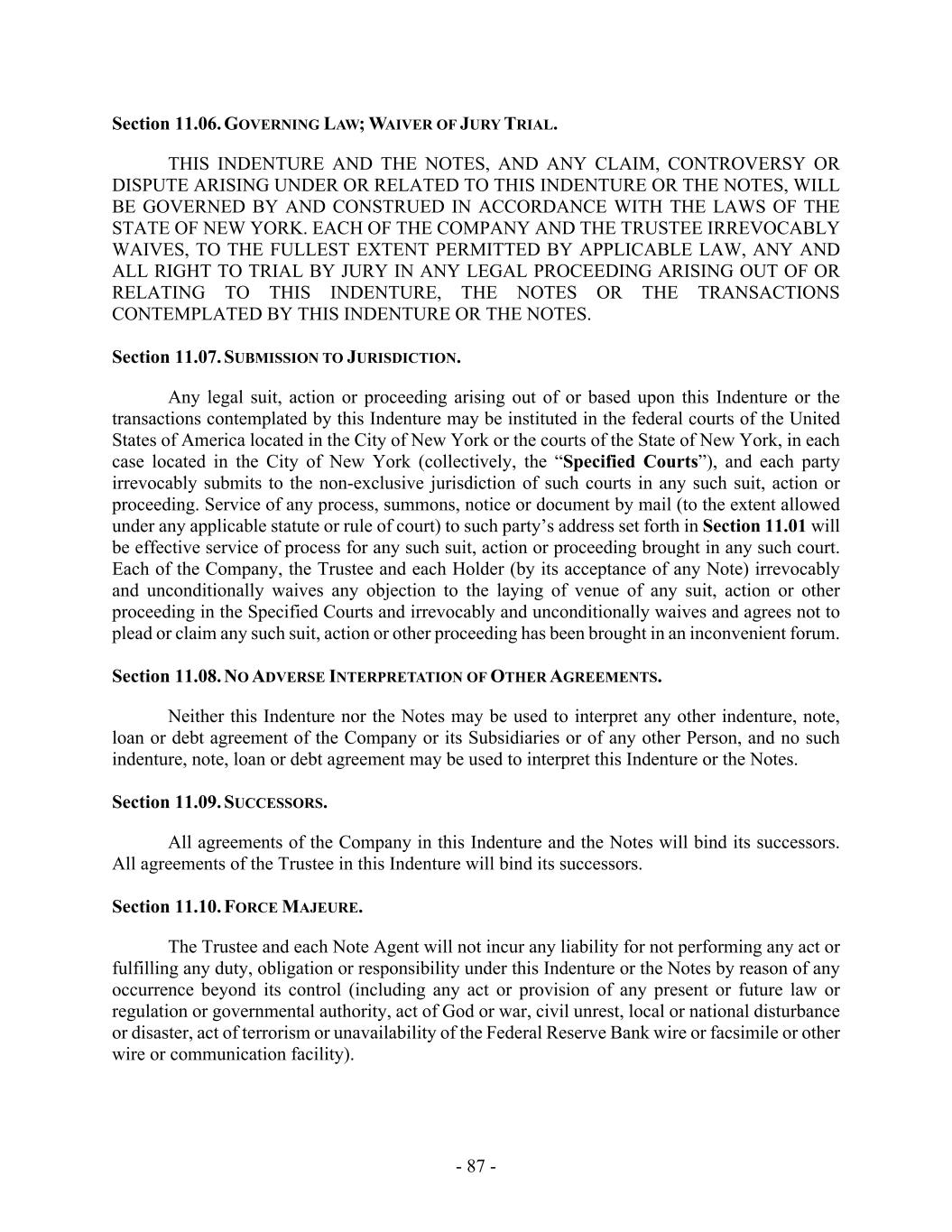 - 87 - Section 11.06. GOVERNING LAW; WAIVER OF JURY TRIAL. THIS INDENTURE AND THE NOTES, AND ANY CLAIM, CONTROVERSY OR DISPUTE ARISING UNDER OR RELATED TO THIS INDENTURE OR THE NOTES, WILL BE GOVERNED BY AND CONSTRUED IN ACCORDANCE WITH THE LAWS OF THE STATE OF NEW YORK. EACH OF THE COMPANY AND THE TRUSTEE IRREVOCABLY WAIVES, TO THE FULLEST EXTENT PERMITTED BY APPLICABLE LAW, ANY AND ALL RIGHT TO TRIAL BY JURY IN ANY LEGAL PROCEEDING ARISING OUT OF OR RELATING TO THIS INDENTURE, THE NOTES OR THE TRANSACTIONS CONTEMPLATED BY THIS INDENTURE OR THE NOTES. Section 11.07. SUBMISSION TO JURISDICTION. Any legal suit, action or proceeding arising out of or based upon this Indenture or the transactions contemplated by this Indenture may be instituted in the federal courts of the United States of America located in the City of New York or the courts of the State of New York, in each case located in the City of New York (collectively, the “Specified Courts”), and each party irrevocably submits to the non-exclusive jurisdiction of such courts in any such suit, action or proceeding. Service of any process, summons, notice or document by mail (to the extent allowed under any applicable statute or rule of court) to such party’s address set forth in Section 11.01 will be effective service of process for any such suit, action or proceeding brought in any such court. Each of the Company, the Trustee and each Holder (by its acceptance of any Note) irrevocably and unconditionally waives any objection to the laying of venue of any suit, action or other proceeding in the Specified Courts and irrevocably and unconditionally waives and agrees not to plead or claim any such suit, action or other proceeding has been brought in an inconvenient forum. Section 11.08. NO ADVERSE INTERPRETATION OF OTHER AGREEMENTS. Neither this Indenture nor the Notes may be used to interpret any other indenture, note, loan or debt agreement of the Company or its Subsidiaries or of any other Person, and no such indenture, note, loan or debt agreement may be used to interpret this Indenture or the Notes. Section 11.09. SUCCESSORS. All agreements of the Company in this Indenture and the Notes will bind its successors. All agreements of the Trustee in this Indenture will bind its successors. Section 11.10. FORCE MAJEURE. The Trustee and each Note Agent will not incur any liability for not performing any act or fulfilling any duty, obligation or responsibility under this Indenture or the Notes by reason of any occurrence beyond its control (including any act or provision of any present or future law or regulation or governmental authority, act of God or war, civil unrest, local or national disturbance or disaster, act of terrorism or unavailability of the Federal Reserve Bank wire or facsimile or other wire or communication facility).