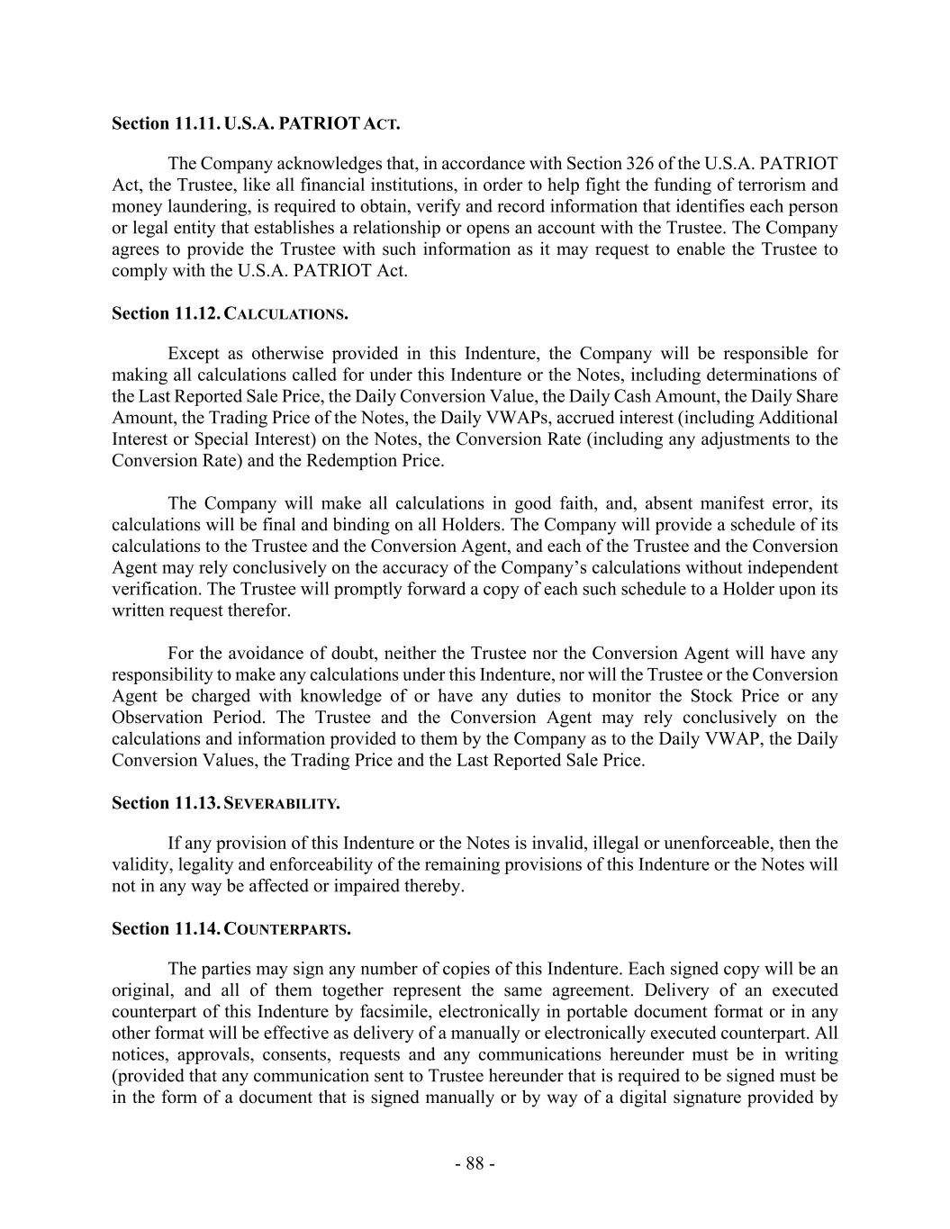- 88 - Section 11.11. U.S.A. PATRIOT ACT. The Company acknowledges that, in accordance with Section 326 of the U.S.A. PATRIOT Act, the Trustee, like all financial institutions, in order to help fight the funding of terrorism and money laundering, is required to obtain, verify and record information that identifies each person or legal entity that establishes a relationship or opens an account with the Trustee. The Company agrees to provide the Trustee with such information as it may request to enable the Trustee to comply with the U.S.A. PATRIOT Act. Section 11.12. CALCULATIONS. Except as otherwise provided in this Indenture, the Company will be responsible for making all calculations called for under this Indenture or the Notes, including determinations of the Last Reported Sale Price, the Daily Conversion Value, the Daily Cash Amount, the Daily Share Amount, the Trading Price of the Notes, the Daily VWAPs, accrued interest (including Additional Interest or Special Interest) on the Notes, the Conversion Rate (including any adjustments to the Conversion Rate) and the Redemption Price. The Company will make all calculations in good faith, and, absent manifest error, its calculations will be final and binding on all Holders. The Company will provide a schedule of its calculations to the Trustee and the Conversion Agent, and each of the Trustee and the Conversion Agent may rely conclusively on the accuracy of the Company’s calculations without independent verification. The Trustee will promptly forward a copy of each such schedule to a Holder upon its written request therefor. For the avoidance of doubt, neither the Trustee nor the Conversion Agent will have any responsibility to make any calculations under this Indenture, nor will the Trustee or the Conversion Agent be charged with knowledge of or have any duties to monitor the Stock Price or any Observation Period. The Trustee and the Conversion Agent may rely conclusively on the calculations and information provided to them by the Company as to the Daily VWAP, the Daily Conversion Values, the Trading Price and the Last Reported Sale Price. Section 11.13. SEVERABILITY. If any provision of this Indenture or the Notes is invalid, illegal or unenforceable, then the validity, legality and enforceability of the remaining provisions of this Indenture or the Notes will not in any way be affected or impaired thereby. Section 11.14. COUNTERPARTS. The parties may sign any number of copies of this Indenture. Each signed copy will be an original, and all of them together represent the same agreement. Delivery of an executed counterpart of this Indenture by facsimile, electronically in portable document format or in any other format will be effective as delivery of a manually or electronically executed counterpart. All notices, approvals, consents, requests and any communications hereunder must be in writing (provided that any communication sent to Trustee hereunder that is required to be signed must be in the form of a document that is signed manually or by way of a digital signature provided by