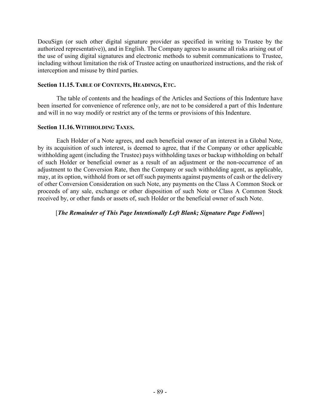 - 89 - DocuSign (or such other digital signature provider as specified in writing to Trustee by the authorized representative)), and in English. The Company agrees to assume all risks arising out of the use of using digital signatures and electronic methods to submit communications to Trustee, including without limitation the risk of Trustee acting on unauthorized instructions, and the risk of interception and misuse by third parties. Section 11.15. TABLE OF CONTENTS, HEADINGS, ETC. The table of contents and the headings of the Articles and Sections of this Indenture have been inserted for convenience of reference only, are not to be considered a part of this Indenture and will in no way modify or restrict any of the terms or provisions of this Indenture. Section 11.16. WITHHOLDING TAXES. Each Holder of a Note agrees, and each beneficial owner of an interest in a Global Note, by its acquisition of such interest, is deemed to agree, that if the Company or other applicable withholding agent (including the Trustee) pays withholding taxes or backup withholding on behalf of such Holder or beneficial owner as a result of an adjustment or the non-occurrence of an adjustment to the Conversion Rate, then the Company or such withholding agent, as applicable, may, at its option, withhold from or set off such payments against payments of cash or the delivery of other Conversion Consideration on such Note, any payments on the Class A Common Stock or proceeds of any sale, exchange or other disposition of such Note or Class A Common Stock received by, or other funds or assets of, such Holder or the beneficial owner of such Note. [The Remainder of This Page Intentionally Left Blank; Signature Page Follows]