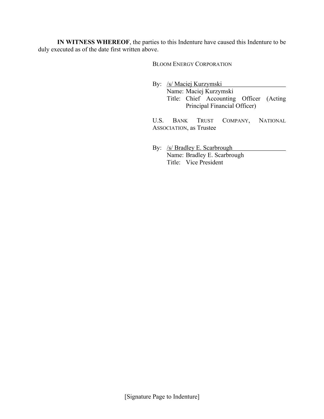 [Signature Page to Indenture] IN WITNESS WHEREOF, the parties to this Indenture have caused this Indenture to be duly executed as of the date first written above. BLOOM ENERGY CORPORATION By: /s/ Maciej Kurzymski Name: Maciej Kurzymski Title: Chief Accounting Officer (Acting Principal Financial Officer) U.S. BANK TRUST COMPANY, NATIONAL ASSOCIATION, as Trustee By: /s/ Bradley E. Scarbrough Name: Bradley E. Scarbrough Title: Vice President