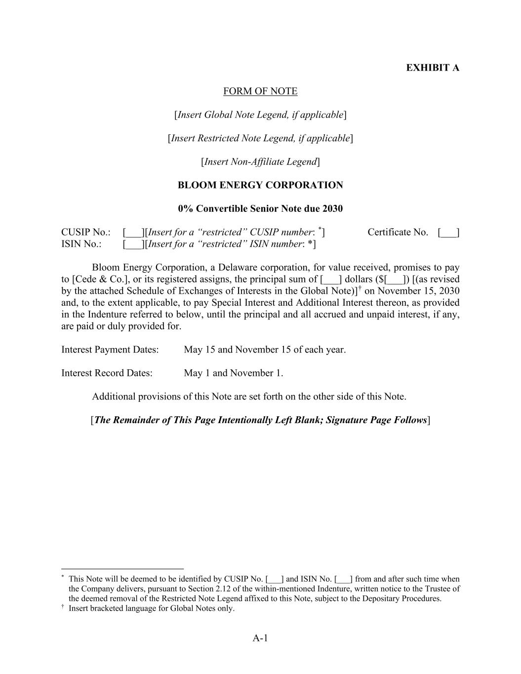 A-1 EXHIBIT A FORM OF NOTE [Insert Global Note Legend, if applicable] [Insert Restricted Note Legend, if applicable] [Insert Non-Affiliate Legend] BLOOM ENERGY CORPORATION 0% Convertible Senior Note due 2030 CUSIP No.: [___][Insert for a “restricted” CUSIP number: *] Certificate No. [___] ISIN No.: [___][Insert for a “restricted” ISIN number: *] Bloom Energy Corporation, a Delaware corporation, for value received, promises to pay to [Cede & Co.], or its registered assigns, the principal sum of [___] dollars ($[___]) [(as revised by the attached Schedule of Exchanges of Interests in the Global Note)]† on November 15, 2030 and, to the extent applicable, to pay Special Interest and Additional Interest thereon, as provided in the Indenture referred to below, until the principal and all accrued and unpaid interest, if any, are paid or duly provided for. Interest Payment Dates: May 15 and November 15 of each year. Interest Record Dates: May 1 and November 1. Additional provisions of this Note are set forth on the other side of this Note. [The Remainder of This Page Intentionally Left Blank; Signature Page Follows] * This Note will be deemed to be identified by CUSIP No. [___] and ISIN No. [___] from and after such time when the Company delivers, pursuant to Section 2.12 of the within-mentioned Indenture, written notice to the Trustee of the deemed removal of the Restricted Note Legend affixed to this Note, subject to the Depositary Procedures. † Insert bracketed language for Global Notes only.