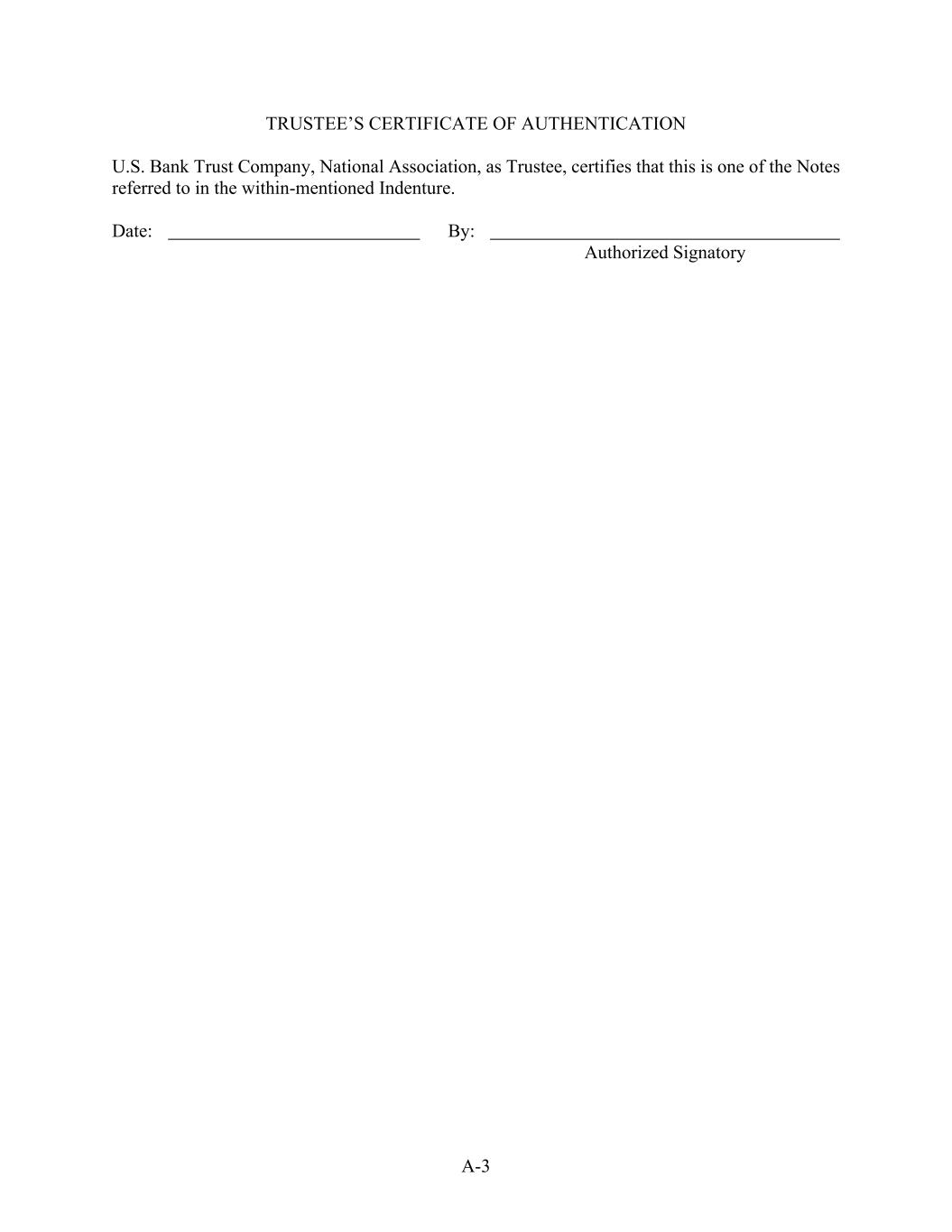 A-3 TRUSTEE’S CERTIFICATE OF AUTHENTICATION U.S. Bank Trust Company, National Association, as Trustee, certifies that this is one of the Notes referred to in the within-mentioned Indenture. Date: By: Authorized Signatory