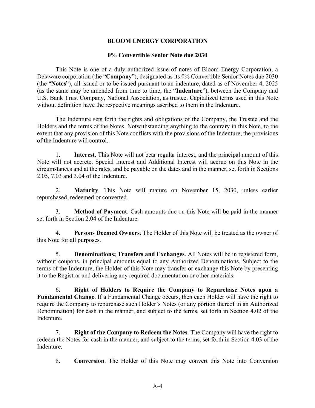 A-4 BLOOM ENERGY CORPORATION 0% Convertible Senior Note due 2030 This Note is one of a duly authorized issue of notes of Bloom Energy Corporation, a Delaware corporation (the “Company”), designated as its 0% Convertible Senior Notes due 2030 (the “Notes”), all issued or to be issued pursuant to an indenture, dated as of November 4, 2025 (as the same may be amended from time to time, the “Indenture”), between the Company and U.S. Bank Trust Company, National Association, as trustee. Capitalized terms used in this Note without definition have the respective meanings ascribed to them in the Indenture. The Indenture sets forth the rights and obligations of the Company, the Trustee and the Holders and the terms of the Notes. Notwithstanding anything to the contrary in this Note, to the extent that any provision of this Note conflicts with the provisions of the Indenture, the provisions of the Indenture will control. 1. Interest. This Note will not bear regular interest, and the principal amount of this Note will not accrete. Special Interest and Additional Interest will accrue on this Note in the circumstances and at the rates, and be payable on the dates and in the manner, set forth in Sections 2.05, 7.03 and 3.04 of the Indenture. 2. Maturity. This Note will mature on November 15, 2030, unless earlier repurchased, redeemed or converted. 3. Method of Payment. Cash amounts due on this Note will be paid in the manner set forth in Section 2.04 of the Indenture. 4. Persons Deemed Owners. The Holder of this Note will be treated as the owner of this Note for all purposes. 5. Denominations; Transfers and Exchanges. All Notes will be in registered form, without coupons, in principal amounts equal to any Authorized Denominations. Subject to the terms of the Indenture, the Holder of this Note may transfer or exchange this Note by presenting it to the Registrar and delivering any required documentation or other materials. 6. Right of Holders to Require the Company to Repurchase Notes upon a Fundamental Change. If a Fundamental Change occurs, then each Holder will have the right to require the Company to repurchase such Holder’s Notes (or any portion thereof in an Authorized Denomination) for cash in the manner, and subject to the terms, set forth in Section 4.02 of the Indenture. 7. Right of the Company to Redeem the Notes. The Company will have the right to redeem the Notes for cash in the manner, and subject to the terms, set forth in Section 4.03 of the Indenture. 8. Conversion. The Holder of this Note may convert this Note into Conversion