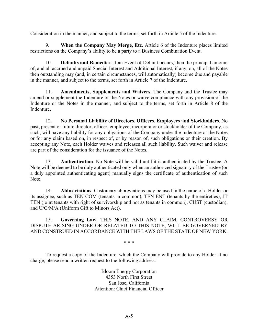 A-5 Consideration in the manner, and subject to the terms, set forth in Article 5 of the Indenture. 9. When the Company May Merge, Etc. Article 6 of the Indenture places limited restrictions on the Company’s ability to be a party to a Business Combination Event. 10. Defaults and Remedies. If an Event of Default occurs, then the principal amount of, and all accrued and unpaid Special Interest and Additional Interest, if any, on, all of the Notes then outstanding may (and, in certain circumstances, will automatically) become due and payable in the manner, and subject to the terms, set forth in Article 7 of the Indenture. 11. Amendments, Supplements and Waivers. The Company and the Trustee may amend or supplement the Indenture or the Notes or waive compliance with any provision of the Indenture or the Notes in the manner, and subject to the terms, set forth in Article 8 of the Indenture. 12. No Personal Liability of Directors, Officers, Employees and Stockholders. No past, present or future director, officer, employee, incorporator or stockholder of the Company, as such, will have any liability for any obligations of the Company under the Indenture or the Notes or for any claim based on, in respect of, or by reason of, such obligations or their creation. By accepting any Note, each Holder waives and releases all such liability. Such waiver and release are part of the consideration for the issuance of the Notes. 13. Authentication. No Note will be valid until it is authenticated by the Trustee. A Note will be deemed to be duly authenticated only when an authorized signatory of the Trustee (or a duly appointed authenticating agent) manually signs the certificate of authentication of such Note. 14. Abbreviations. Customary abbreviations may be used in the name of a Holder or its assignee, such as TEN COM (tenants in common), TEN ENT (tenants by the entireties), JT TEN (joint tenants with right of survivorship and not as tenants in common), CUST (custodian), and U/G/M/A (Uniform Gift to Minors Act). 15. Governing Law. THIS NOTE, AND ANY CLAIM, CONTROVERSY OR DISPUTE ARISING UNDER OR RELATED TO THIS NOTE, WILL BE GOVERNED BY AND CONSTRUED IN ACCORDANCE WITH THE LAWS OF THE STATE OF NEW YORK. * * * To request a copy of the Indenture, which the Company will provide to any Holder at no charge, please send a written request to the following address: Bloom Energy Corporation 4353 North First Street San Jose, California Attention: Chief Financial Officer