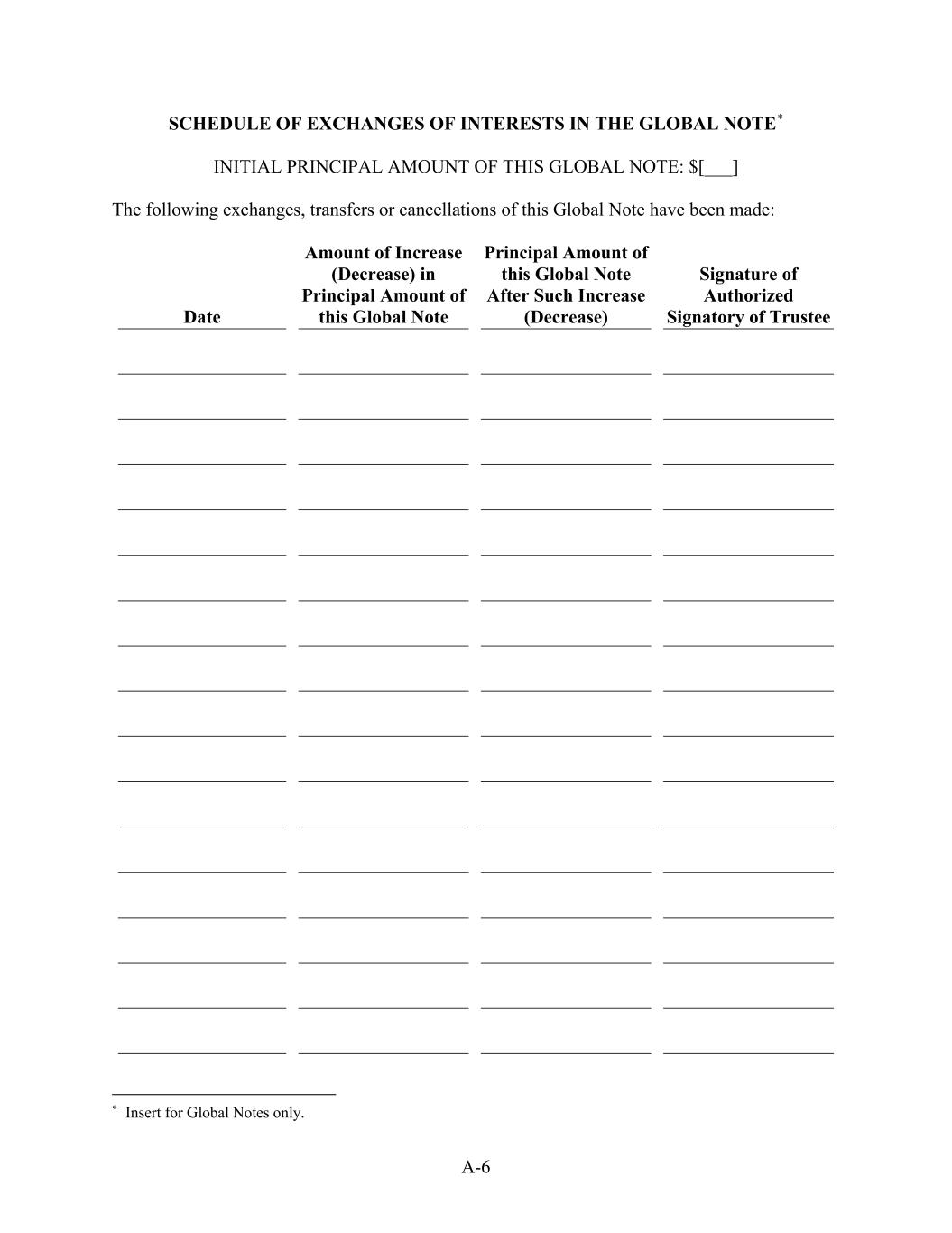 A-6 SCHEDULE OF EXCHANGES OF INTERESTS IN THE GLOBAL NOTE* INITIAL PRINCIPAL AMOUNT OF THIS GLOBAL NOTE: $[___] The following exchanges, transfers or cancellations of this Global Note have been made: Date Amount of Increase (Decrease) in Principal Amount of this Global Note Principal Amount of this Global Note After Such Increase (Decrease) Signature of Authorized Signatory of Trustee * Insert for Global Notes only.