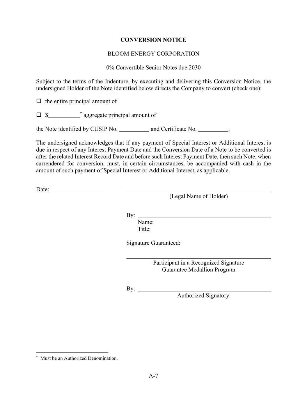 A-7 CONVERSION NOTICE BLOOM ENERGY CORPORATION 0% Convertible Senior Notes due 2030 Subject to the terms of the Indenture, by executing and delivering this Conversion Notice, the undersigned Holder of the Note identified below directs the Company to convert (check one):  the entire principal amount of  $ * aggregate principal amount of the Note identified by CUSIP No. and Certificate No. . The undersigned acknowledges that if any payment of Special Interest or Additional Interest is due in respect of any Interest Payment Date and the Conversion Date of a Note to be converted is after the related Interest Record Date and before such Interest Payment Date, then such Note, when surrendered for conversion, must, in certain circumstances, be accompanied with cash in the amount of such payment of Special Interest or Additional Interest, as applicable. Date: (Legal Name of Holder) By: Name: Title: Signature Guaranteed: Participant in a Recognized Signature Guarantee Medallion Program By: Authorized Signatory * Must be an Authorized Denomination.