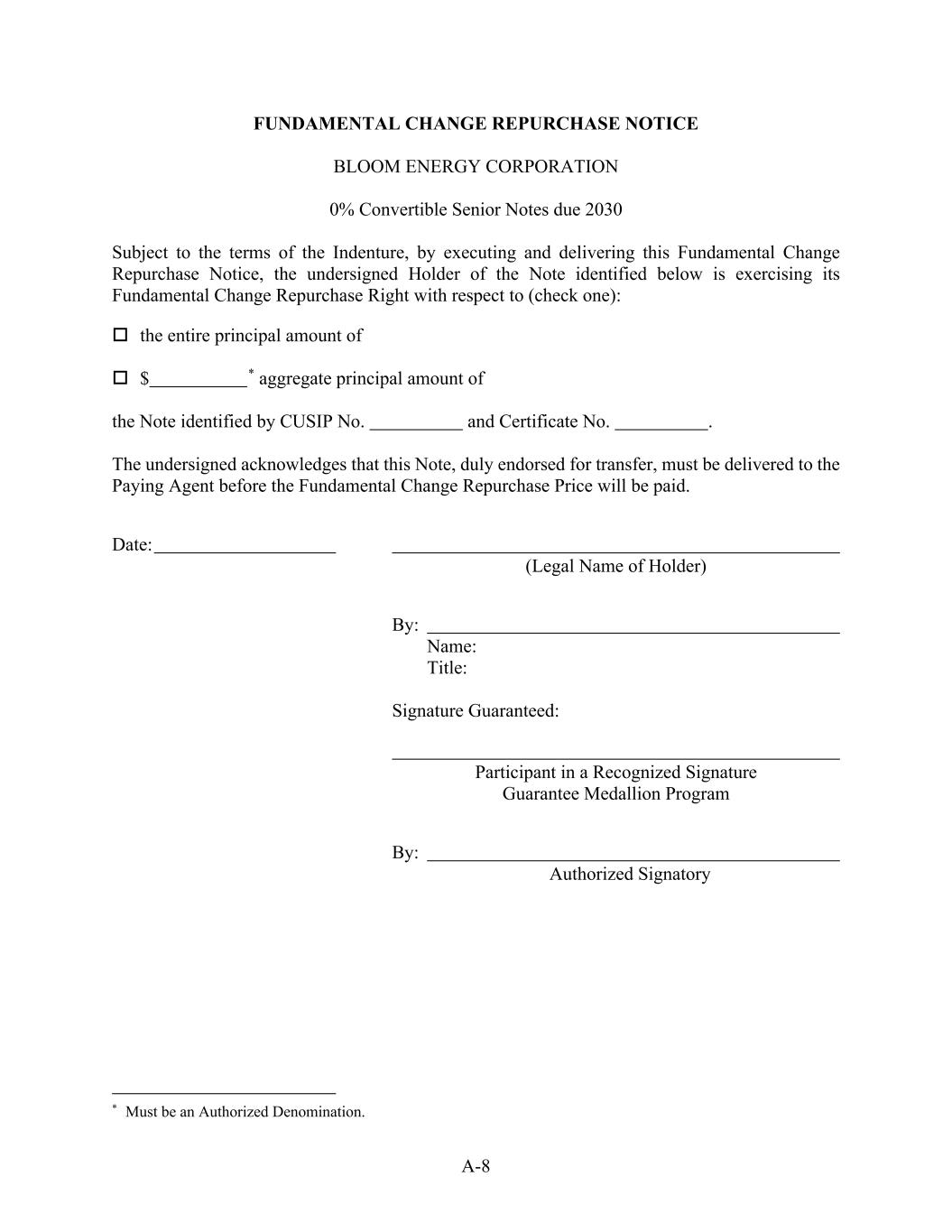 A-8 FUNDAMENTAL CHANGE REPURCHASE NOTICE BLOOM ENERGY CORPORATION 0% Convertible Senior Notes due 2030 Subject to the terms of the Indenture, by executing and delivering this Fundamental Change Repurchase Notice, the undersigned Holder of the Note identified below is exercising its Fundamental Change Repurchase Right with respect to (check one):  the entire principal amount of  $ * aggregate principal amount of the Note identified by CUSIP No. and Certificate No. . The undersigned acknowledges that this Note, duly endorsed for transfer, must be delivered to the Paying Agent before the Fundamental Change Repurchase Price will be paid. Date: (Legal Name of Holder) By: Name: Title: Signature Guaranteed: Participant in a Recognized Signature Guarantee Medallion Program By: Authorized Signatory * Must be an Authorized Denomination.