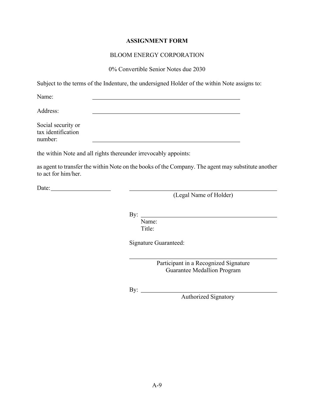 A-9 ASSIGNMENT FORM BLOOM ENERGY CORPORATION 0% Convertible Senior Notes due 2030 Subject to the terms of the Indenture, the undersigned Holder of the within Note assigns to: Name: Address: Social security or tax identification number: the within Note and all rights thereunder irrevocably appoints: as agent to transfer the within Note on the books of the Company. The agent may substitute another to act for him/her. Date: (Legal Name of Holder) By: Name: Title: Signature Guaranteed: Participant in a Recognized Signature Guarantee Medallion Program By: Authorized Signatory