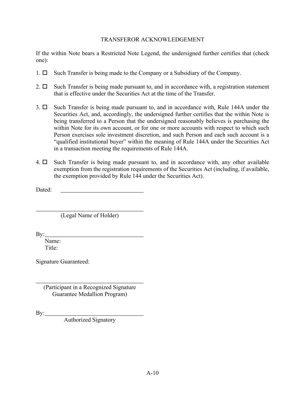 A-10 TRANSFEROR ACKNOWLEDGEMENT If the within Note bears a Restricted Note Legend, the undersigned further certifies that (check one): 1.  Such Transfer is being made to the Company or a Subsidiary of the Company. 2.  Such Transfer is being made pursuant to, and in accordance with, a registration statement that is effective under the Securities Act at the time of the Transfer. 3.  Such Transfer is being made pursuant to, and in accordance with, Rule 144A under the Securities Act, and, accordingly, the undersigned further certifies that the within Note is being transferred to a Person that the undersigned reasonably believes is purchasing the within Note for its own account, or for one or more accounts with respect to which such Person exercises sole investment discretion, and such Person and each such account is a “qualified institutional buyer” within the meaning of Rule 144A under the Securities Act in a transaction meeting the requirements of Rule 144A. 4.  Such Transfer is being made pursuant to, and in accordance with, any other available exemption from the registration requirements of the Securities Act (including, if available, the exemption provided by Rule 144 under the Securities Act). Dated: (Legal Name of Holder) By: Name: Title: Signature Guaranteed: (Participant in a Recognized Signature Guarantee Medallion Program) By: Authorized Signatory