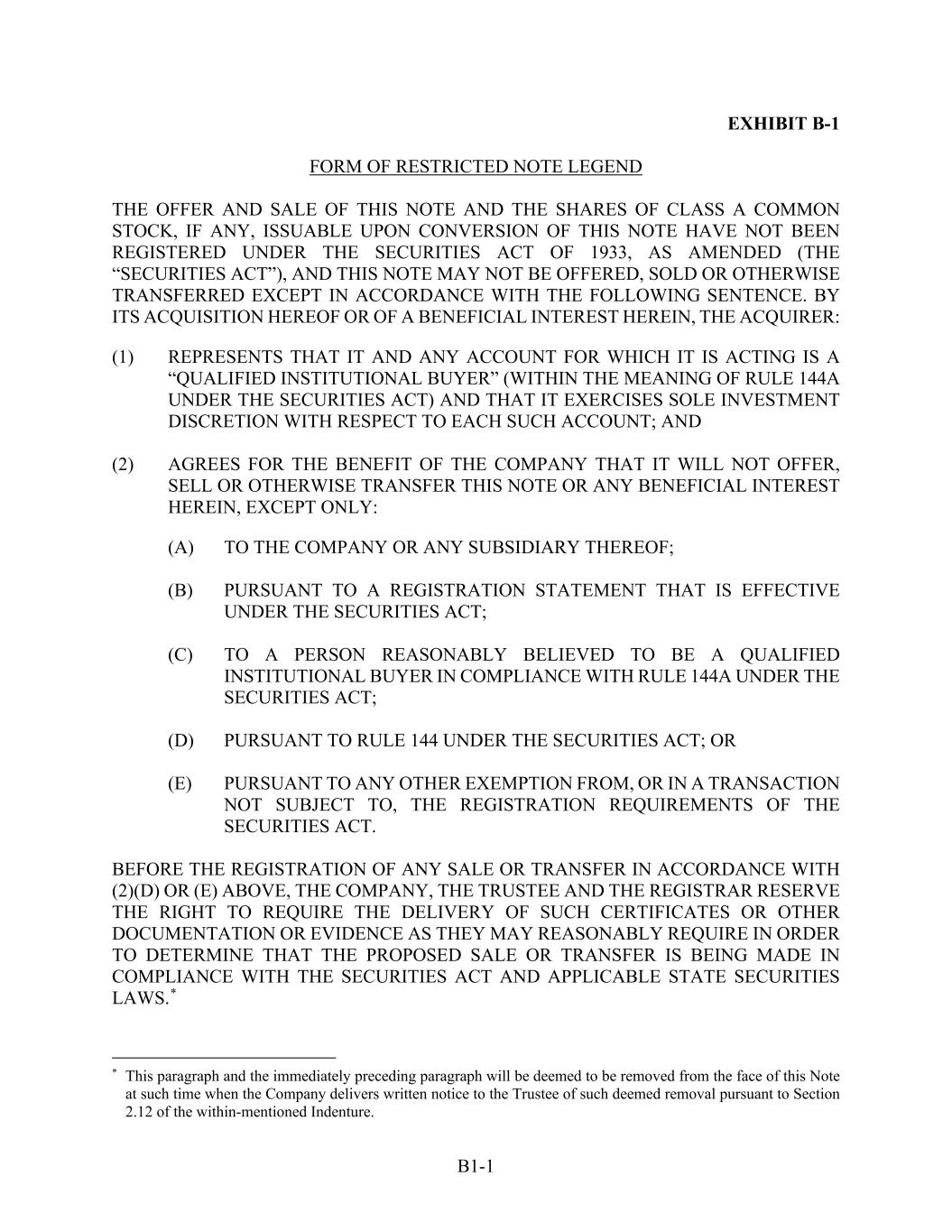 B1-1 EXHIBIT B-1 FORM OF RESTRICTED NOTE LEGEND THE OFFER AND SALE OF THIS NOTE AND THE SHARES OF CLASS A COMMON STOCK, IF ANY, ISSUABLE UPON CONVERSION OF THIS NOTE HAVE NOT BEEN REGISTERED UNDER THE SECURITIES ACT OF 1933, AS AMENDED (THE “SECURITIES ACT”), AND THIS NOTE MAY NOT BE OFFERED, SOLD OR OTHERWISE TRANSFERRED EXCEPT IN ACCORDANCE WITH THE FOLLOWING SENTENCE. BY ITS ACQUISITION HEREOF OR OF A BENEFICIAL INTEREST HEREIN, THE ACQUIRER: (1) REPRESENTS THAT IT AND ANY ACCOUNT FOR WHICH IT IS ACTING IS A “QUALIFIED INSTITUTIONAL BUYER” (WITHIN THE MEANING OF RULE 144A UNDER THE SECURITIES ACT) AND THAT IT EXERCISES SOLE INVESTMENT DISCRETION WITH RESPECT TO EACH SUCH ACCOUNT; AND (2) AGREES FOR THE BENEFIT OF THE COMPANY THAT IT WILL NOT OFFER, SELL OR OTHERWISE TRANSFER THIS NOTE OR ANY BENEFICIAL INTEREST HEREIN, EXCEPT ONLY: (A) TO THE COMPANY OR ANY SUBSIDIARY THEREOF; (B) PURSUANT TO A REGISTRATION STATEMENT THAT IS EFFECTIVE UNDER THE SECURITIES ACT; (C) TO A PERSON REASONABLY BELIEVED TO BE A QUALIFIED INSTITUTIONAL BUYER IN COMPLIANCE WITH RULE 144A UNDER THE SECURITIES ACT; (D) PURSUANT TO RULE 144 UNDER THE SECURITIES ACT; OR (E) PURSUANT TO ANY OTHER EXEMPTION FROM, OR IN A TRANSACTION NOT SUBJECT TO, THE REGISTRATION REQUIREMENTS OF THE SECURITIES ACT. BEFORE THE REGISTRATION OF ANY SALE OR TRANSFER IN ACCORDANCE WITH (2)(D) OR (E) ABOVE, THE COMPANY, THE TRUSTEE AND THE REGISTRAR RESERVE THE RIGHT TO REQUIRE THE DELIVERY OF SUCH CERTIFICATES OR OTHER DOCUMENTATION OR EVIDENCE AS THEY MAY REASONABLY REQUIRE IN ORDER TO DETERMINE THAT THE PROPOSED SALE OR TRANSFER IS BEING MADE IN COMPLIANCE WITH THE SECURITIES ACT AND APPLICABLE STATE SECURITIES LAWS.* * This paragraph and the immediately preceding paragraph will be deemed to be removed from the face of this Note at such time when the Company delivers written notice to the Trustee of such deemed removal pursuant to Section 2.12 of the within-mentioned Indenture.
