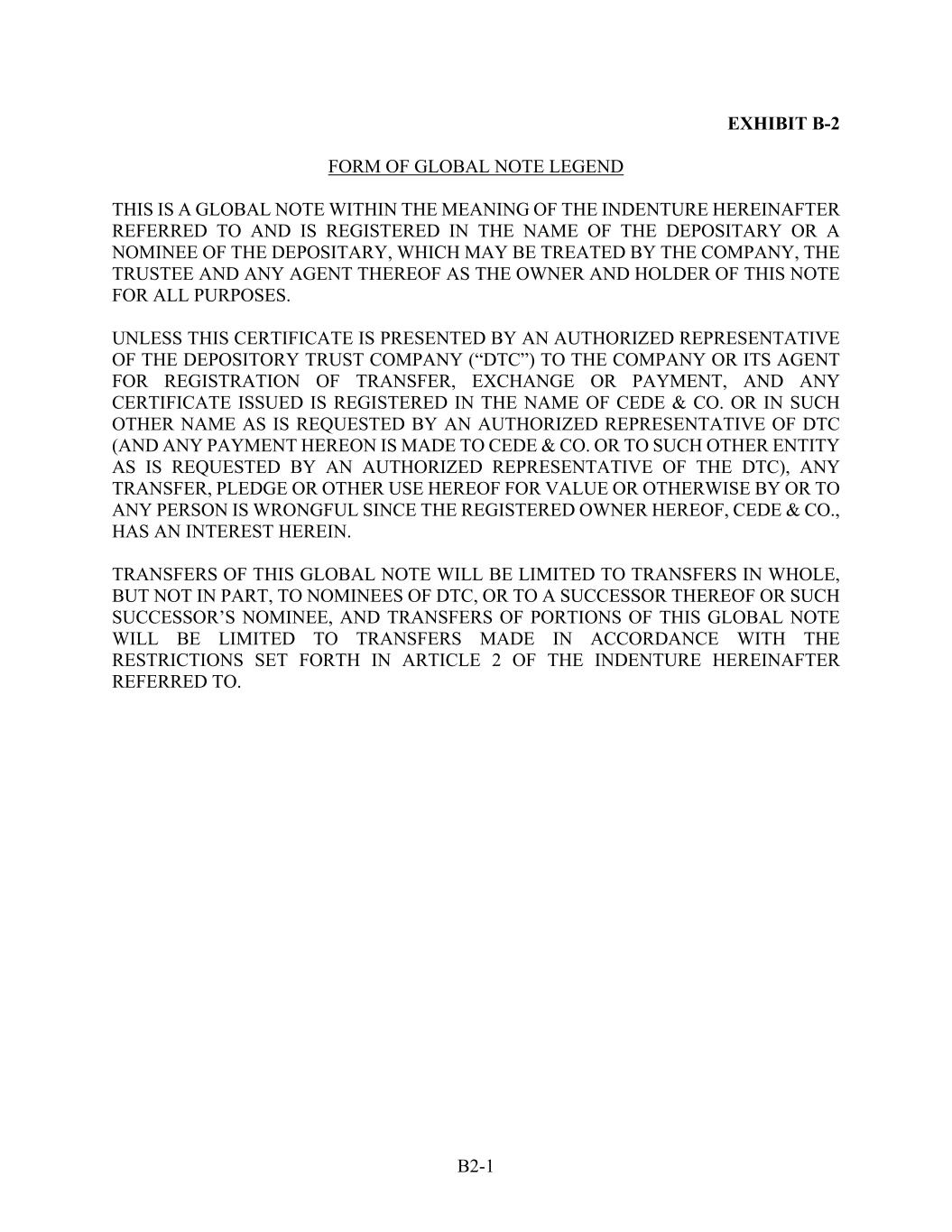 B2-1 EXHIBIT B-2 FORM OF GLOBAL NOTE LEGEND THIS IS A GLOBAL NOTE WITHIN THE MEANING OF THE INDENTURE HEREINAFTER REFERRED TO AND IS REGISTERED IN THE NAME OF THE DEPOSITARY OR A NOMINEE OF THE DEPOSITARY, WHICH MAY BE TREATED BY THE COMPANY, THE TRUSTEE AND ANY AGENT THEREOF AS THE OWNER AND HOLDER OF THIS NOTE FOR ALL PURPOSES. UNLESS THIS CERTIFICATE IS PRESENTED BY AN AUTHORIZED REPRESENTATIVE OF THE DEPOSITORY TRUST COMPANY (“DTC”) TO THE COMPANY OR ITS AGENT FOR REGISTRATION OF TRANSFER, EXCHANGE OR PAYMENT, AND ANY CERTIFICATE ISSUED IS REGISTERED IN THE NAME OF CEDE & CO. OR IN SUCH OTHER NAME AS IS REQUESTED BY AN AUTHORIZED REPRESENTATIVE OF DTC (AND ANY PAYMENT HEREON IS MADE TO CEDE & CO. OR TO SUCH OTHER ENTITY AS IS REQUESTED BY AN AUTHORIZED REPRESENTATIVE OF THE DTC), ANY TRANSFER, PLEDGE OR OTHER USE HEREOF FOR VALUE OR OTHERWISE BY OR TO ANY PERSON IS WRONGFUL SINCE THE REGISTERED OWNER HEREOF, CEDE & CO., HAS AN INTEREST HEREIN. TRANSFERS OF THIS GLOBAL NOTE WILL BE LIMITED TO TRANSFERS IN WHOLE, BUT NOT IN PART, TO NOMINEES OF DTC, OR TO A SUCCESSOR THEREOF OR SUCH SUCCESSOR’S NOMINEE, AND TRANSFERS OF PORTIONS OF THIS GLOBAL NOTE WILL BE LIMITED TO TRANSFERS MADE IN ACCORDANCE WITH THE RESTRICTIONS SET FORTH IN ARTICLE 2 OF THE INDENTURE HEREINAFTER REFERRED TO.
