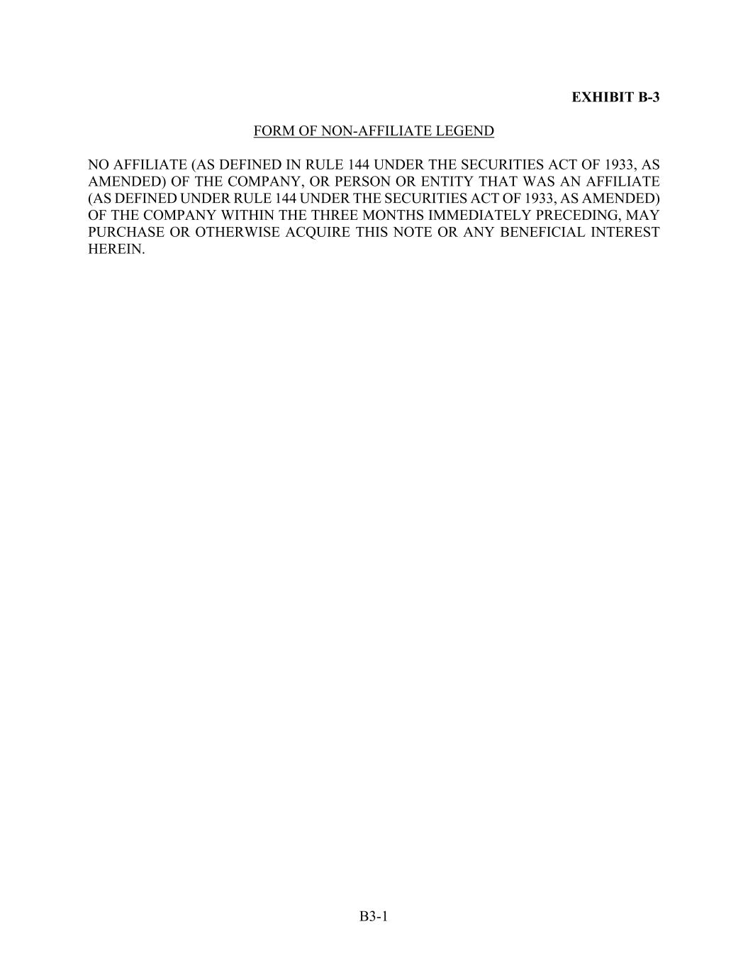 B3-1 EXHIBIT B-3 FORM OF NON-AFFILIATE LEGEND NO AFFILIATE (AS DEFINED IN RULE 144 UNDER THE SECURITIES ACT OF 1933, AS AMENDED) OF THE COMPANY, OR PERSON OR ENTITY THAT WAS AN AFFILIATE (AS DEFINED UNDER RULE 144 UNDER THE SECURITIES ACT OF 1933, AS AMENDED) OF THE COMPANY WITHIN THE THREE MONTHS IMMEDIATELY PRECEDING, MAY PURCHASE OR OTHERWISE ACQUIRE THIS NOTE OR ANY BENEFICIAL INTEREST HEREIN.