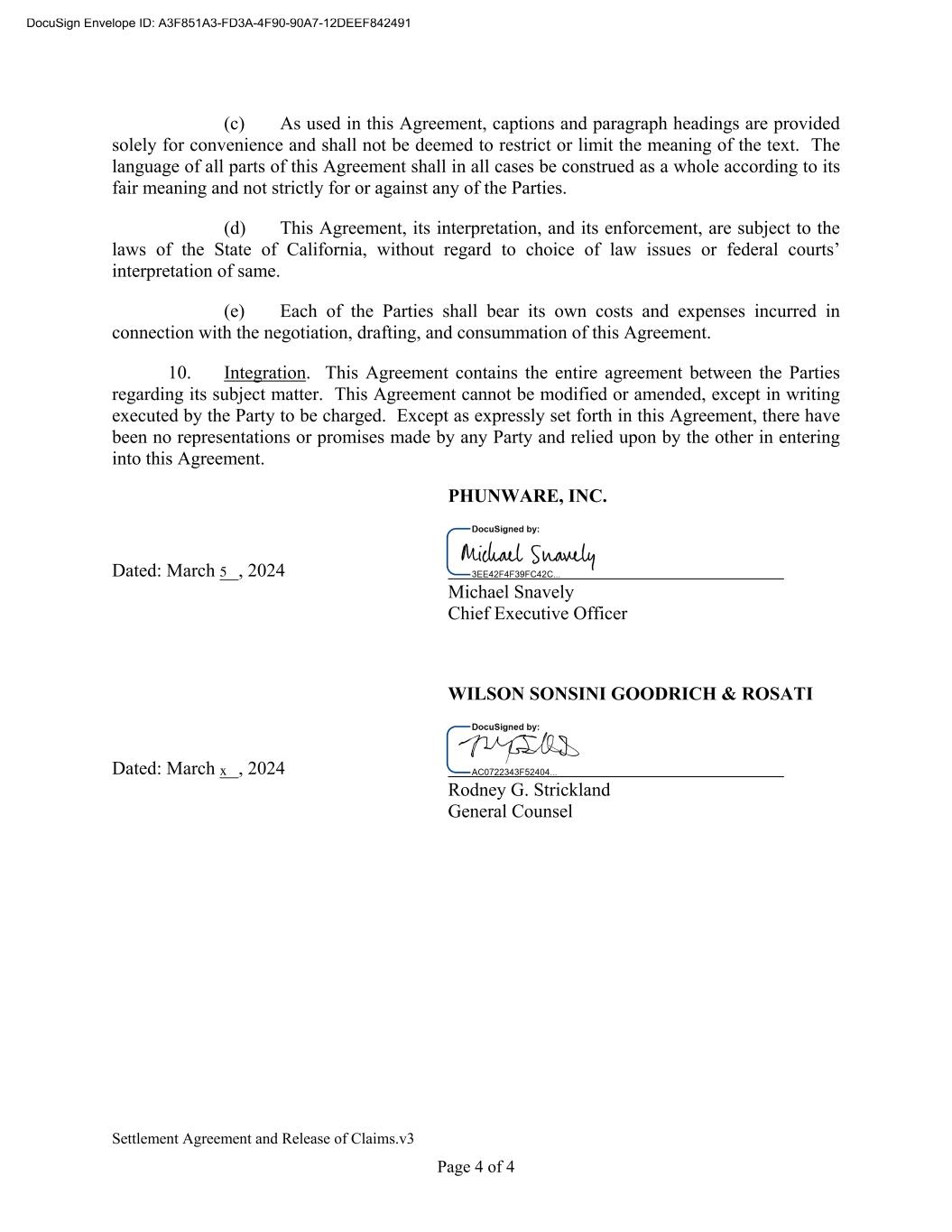 Settlement Agreement and Release of Claims.v3 Page 4 of 4 (c) As used in this Agreement, captions and paragraph headings are provided solely for convenience and shall not be deemed to restrict or limit the meaning of the text. The language of all parts of this Agreement shall in all cases be construed as a whole according to its fair meaning and not strictly for or against any of the Parties. (d) This Agreement, its interpretation, and its enforcement, are subject to the laws of the State of California, without regard to choice of law issues or federal courts’ interpretation of same. (e) Each of the Parties shall bear its own costs and expenses incurred in connection with the negotiation, drafting, and consummation of this Agreement. 10. Integration. This Agreement contains the entire agreement between the Parties regarding its subject matter. This Agreement cannot be modified or amended, except in writing executed by the Party to be charged. Except as expressly set forth in this Agreement, there have been no representations or promises made by any Party and relied upon by the other in entering into this Agreement. PHUNWARE, INC. Dated: March __, 2024 Michael Snavely Chief Executive Officer WILSON SONSINI GOODRICH & ROSATI Dated: March __, 2024 Rodney G. Strickland General Counsel            5 x