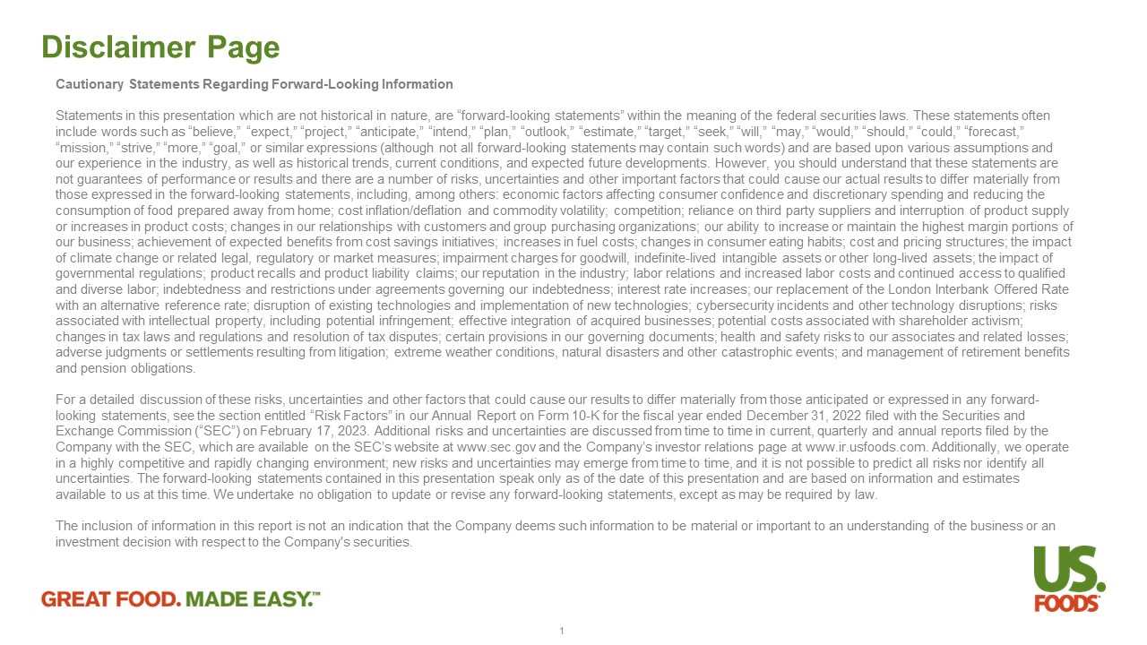 Cautionary Statements Regarding Forward - Looking Information Statements in this presentation which are not historical in nature, are “forward - looking statements” within the meaning of the f ederal securities laws. These statements often include words such as “believe,” “expect,” “project,” “anticipate,” “intend,” “plan,” “outlook,” “estimate,” “target,” “seek, ” “ will,” “may,” “would,” “should,” “could,” “forecast,” “mission,” “strive,” “more,” “goal,” or similar expressions (although not all forward - looking statements may contain such words) and are based upon various assumptions and our experience in the industry, as well as historical trends, current conditions, and expected future developments. However, you should understand that these statements are not guarantees of performance or results and there are a number of risks, uncertainties and other important factors that coul d c ause our actual results to differ materially from those expressed in the forward - looking statements, including, among others: economic factors affecting consumer confidence and d iscretionary spending and reducing the consumption of food prepared away from home; cost inflation/deflation and commodity volatility; competition; reliance on thir d p arty suppliers and interruption of product supply or increases in product costs; changes in our relationships with customers and group purchasing organizations; our ability to in crease or maintain the highest margin portions of our business; achievement of expected benefits from cost savings initiatives; increases in fuel costs; changes in consumer ea tin g habits; cost and pricing structures; the impact of climate change or related legal, regulatory or market measures; impairment charges for goodwill, indefinite - lived intangible assets or other long - lived assets; the impact of governmental regulations; product recalls and product liability claims; our reputation in the industry; labor relations and i ncr eased labor costs and continued access to qualified and diverse labor; indebtedness and restrictions under agreements governing our indebtedness; interest rate increases; our re pla cement of the London Interbank Offered Rate with an alternative reference rate; disruption of existing technologies and implementation of new technologies; cybersecurity in cidents and other technology disruptions; risks associated with intellectual property, including potential infringement; effective integration of acquired businesses; potent ial costs associated with shareholder activism; changes in tax laws and regulations and resolution of tax disputes; certain provisions in our governing documents; health and sa fety risks to our associates and related losses; adverse judgments or settlements resulting from litigation; extreme weather conditions, natural disasters and other catastrop hic events; and management of retirement benefits and pension obligations. For a detailed discussion of these risks, uncertainties and other factors that could cause our results to differ materially f rom those anticipated or expressed in any forward - looking statements, see the section entitled “Risk Factors” in our Annual Report on Form 10 - K for the fiscal year ended December 31, 2022 filed with the Securities and Exchange Commission (“SEC”) on February 17, 2023. Additional risks and uncertainties are discussed from time to time in curre nt, quarterly and annual reports filed by the Company with the SEC, which are available on the SEC’s website at www.sec.gov and the Company’s investor relations page at ww w.i r.usfoods.com. Additionally, we operate in a highly competitive and rapidly changing environment; new risks and uncertainties may emerge from time to time, and it is no t possible to predict all risks nor identify all uncertainties. The forward - looking statements contained in this presentation speak only as of the date of this presentation and are based on information and estimates available to us at this time. We undertake no obligation to update or revise any forward - looking statements, except as may be re quired by law. The inclusion of information in this report is not an indication that the Company deems such information to be material or im por tant to an understanding of the business or an investment decision with respect to the Company's securities. Disclaimer Page 1
