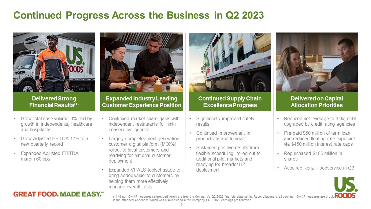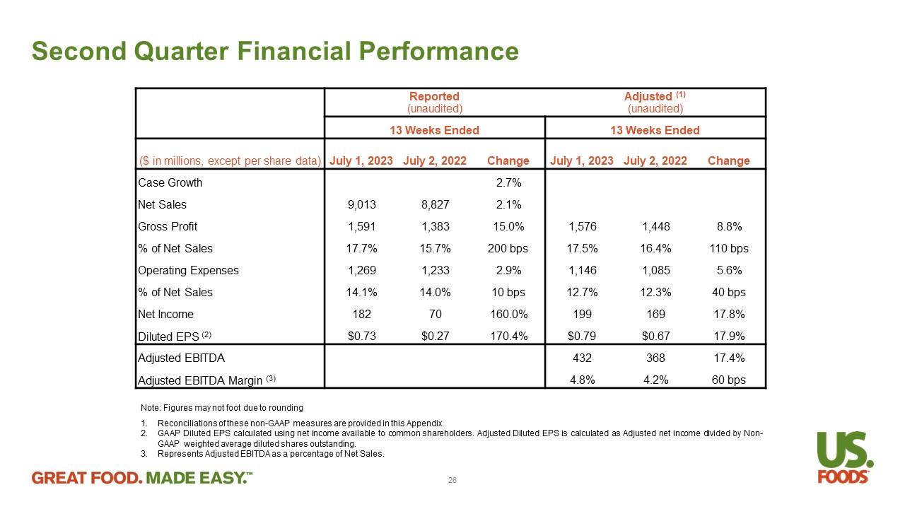 Second Quarter Financial Performance Note : Figures may not foot due to rounding 1. R econciliations of these non - GAAP measures are provided in this Appendix . 2. GAAP Diluted EPS calculated using net income available to common shareholders . Adjusted Diluted EPS is calculated as Adjusted net income divided by Non - GAAP weighted average diluted shares outstanding . 3. Represents Adjusted EBITDA as a percentage of Net Sales . Adjusted (1) (unaudited) Reported (unaudited) 13 Weeks Ended 13 Weeks Ended Change July 2, 2022 July 1, 2023 Change July 2, 2022 July 1, 2023 ($ in millions, except per share data) 2.7% Case Growth 2.1% 8,827 9,013 Net Sales 8.8% 1,448 1,576 15.0% 1,383 1,591 Gross Profit 110 bps 16.4% 17.5% 200 bps 15.7% 17.7% % of Net Sales 5.6% 1,085 1,146 2.9% 1,233 1,269 Operating Expenses 40 bps 12.3% 12.7% 10 bps 14.0% 14.1% % of Net Sales 17.8% 169 199 160.0% 70 182 Net Income 17.9% $0.67 $0.79 170.4% $0.27 $0.73 Diluted EPS (2) 17.4% 368 432 Adjusted EBITDA 60 bps 4.2% 4.8% Adjusted EBITDA Margin (3) 26