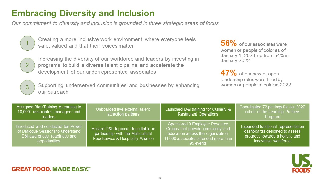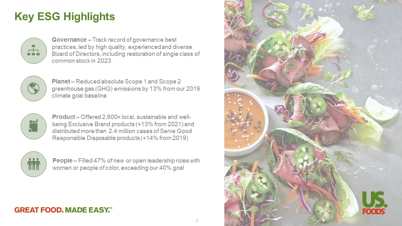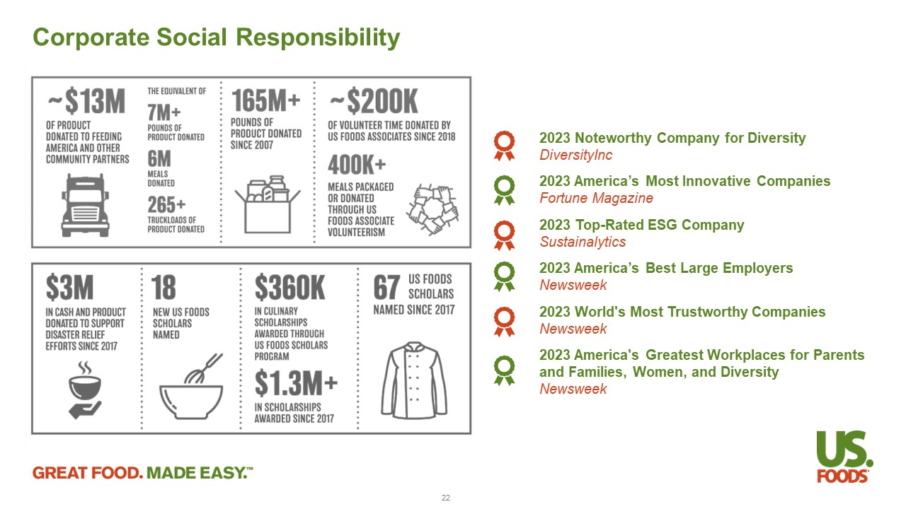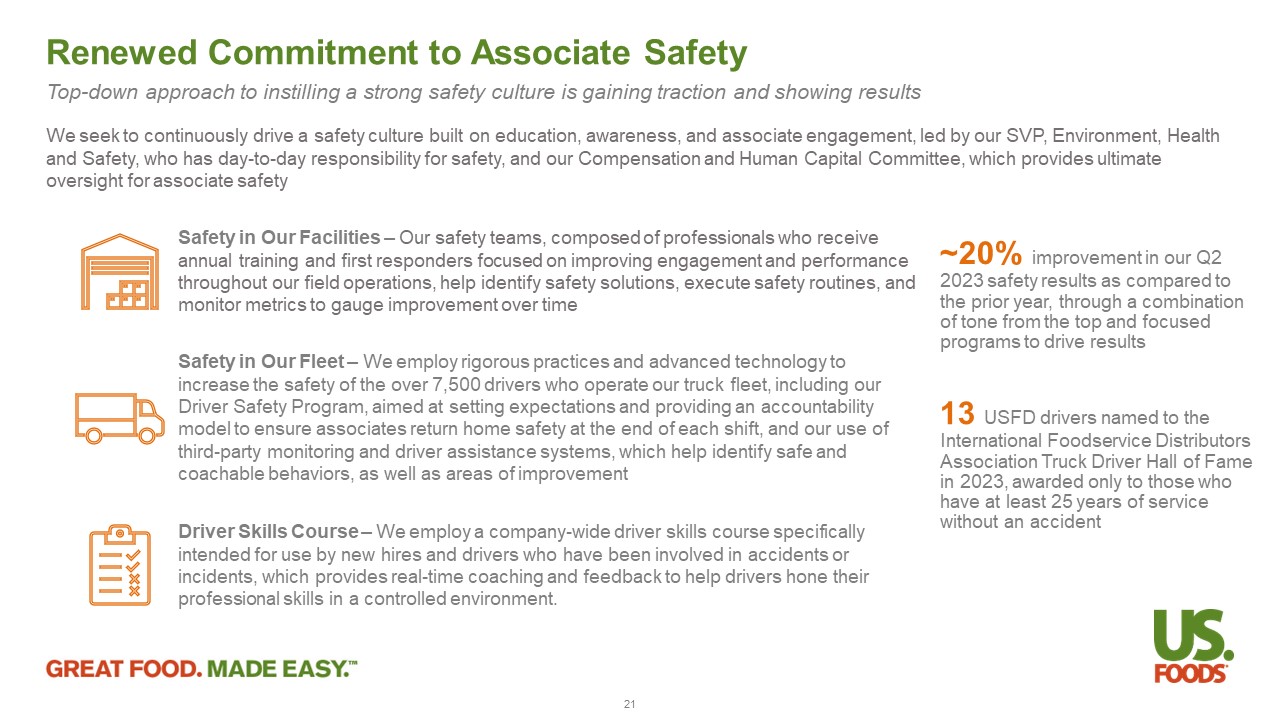 Renewed Commitment to Associate Safety Top - down approach to instilling a strong safety culture is gaining traction and showing results 21 ~20 % improvement in our Q2 2023 safety results as compared to the prior year, through a combination of tone from the top and focused programs to drive results 13 USFD drivers named to the International Foodservice Distributors Association Truck Driver Hall of Fame in 2023, awarded only to those who have at least 25 years of service without an accident We seek to continuously drive a safety culture built on education, awareness, and associate engagement, led by our SVP, Envir onm ent, Health and Safety, who has day - to - day responsibility for safety, and our Compensation and Human Capital Committee, which provides ultim ate oversight for associate safety Safety in Our Facilities – Our safety teams, composed of professionals who receive annual training and first responders focused on improving engagement and performance throughout our field operations, help identify safety solutions, execute safety routines, and monitor metrics to gauge improvement over time Safety in Our Fleet – We employ rigorous practices and advanced technology to increase the safety of the over 7,500 drivers who operate our truck fleet, including our Driver Safety Program, aimed at setting expectations and providing an accountability model to ensure associates return home safety at the end of each shift, and our use of third - party monitoring and driver assistance systems, which help identify safe and coachable behaviors, as well as areas of improvement Driver Skills Course – We employ a company - wide driver skills course specifically intended for use by new hires and drivers who have been involved in accidents or incidents, which provides real - time coaching and feedback to help drivers hone their professional skills in a controlled environment.
