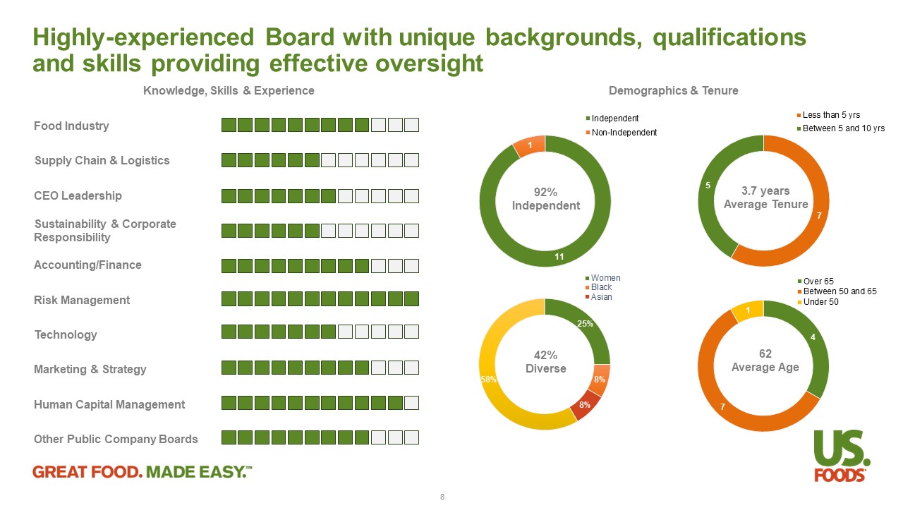Food Industry Supply Chain & Logistics CEO Leadership Sustainability & Corporate Responsibility Accounting/Finance Risk Management Technology Marketing & Strategy Human Capital Management Other Public Company Boards Knowledge, Skills & Experience Highly - experienced Board with unique backgrounds, qualifications and skills providing effective oversight Demographics & Tenure 3.7 years Average Tenure 11 1 Independent Non-Independent 25% 8% 8% 58% Women Black Asian 42% Diverse 4 7 1 Over 65 Between 50 and 65 Under 50 62 Average Age 92% Independent 7 5 Less than 5 yrs Between 5 and 10 yrs 8