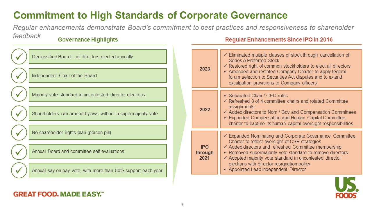 Key ESG Highlights Governance – Track record of governance best practices, led by high quality, experienced and diverse Board of Directors, including restoration of single class of common stock in 2023 Planet – Reduced absolute Scope 1 and Scope 2 greenhouse gas (GHG) emissions by 13% from our 2019 climate goal baseline Product – Offered 2,600+ local, sustainable and well - being Exclusive Brand products (+13% from 2021) and distributed more than 2.4 million cases of Serve Good Responsible Disposable products (+14% from 2019) People – Filled 47% of new or open leadership roles with women or people of color, exceeding our 40% goal 7