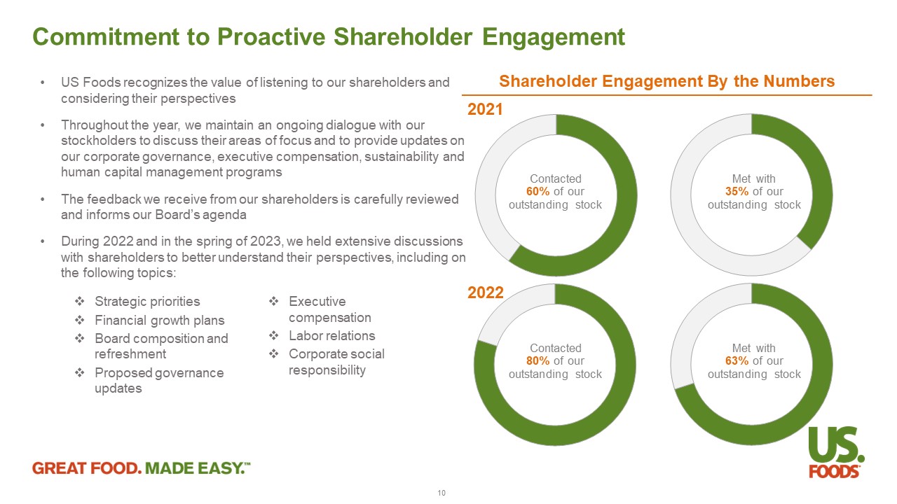 Governance Highlights Declassified Board – all directors elected annually x Majority vote standard in uncontested director elections x Independent Chair of the Board x No shareholder rights plan (poison pill) x Annual say - on - pay vote, with more than 80% support each year x Annual Board and committee self - evaluations x Shareholders can amend bylaws without a supermajority vote x Regular Enhancements Since IPO in 2016 x Expanded Nominating and Corporate Governance Committee Charter to reflect oversight of CSR strategies x Added directors and refreshed Committee membership x Removed supermajority vote standard to remove directors x Adopted majority vote standard in uncontested director elections with director resignation policy x Appointed Lead Independent Director IPO through 2021 x Separated Chair / CEO roles x Refreshed 3 of 4 committee chairs and rotated Committee assignments x Added directors to Nom / Gov and Compensation Committees x Expanded Compensation and Human Capital Committee charter to capture its human capital oversight responsibilities 2022 x Eliminated multiple classes of stock through cancellation of Series A Preferred Stock x Restored right of common stockholders to elect all directors x Amended and restated Company Charter to apply federal forum selection to Securities Act disputes and to extend exculpation provisions to Company officers 2023 Commitment to High Standards of Corporate Governance Regular enhancements demonstrate Board’s commitment to best practices and responsiveness to shareholder feedback 9