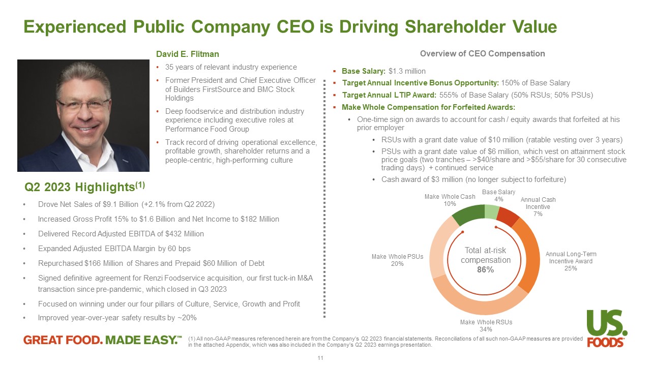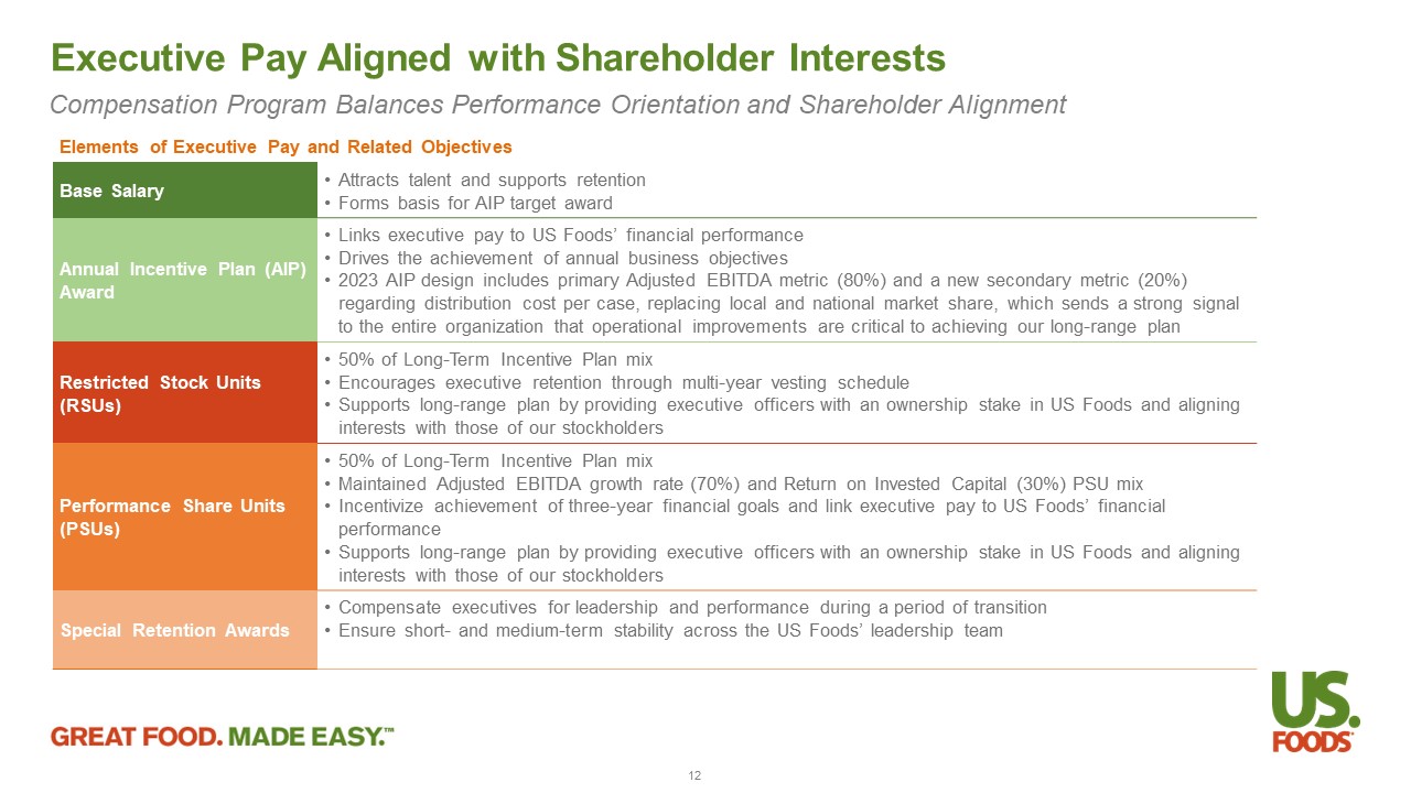 • Drove Net Sales of $9.1 Billion (+2.1% from Q2 2022) • Increased Gross Profit 15% to $1.6 Billion and Net Income to $182 Million • Delivered Record Adjusted EBITDA of $432 Million • Expanded Adjusted EBITDA Margin by 60 bps • Repurchased $166 Million of Shares and Prepaid $60 Million of Debt • Signed definitive agreement for Renzi Foodservice acquisition, our first tuck - in M&A transaction since pre - pandemic, which closed in Q3 2023 • Focused on winning under our four pillars of Culture, Service, Growth and Profit • Improved year - over - year safety results by ~20% Experienced Public Company CEO is Driving Shareholder Value Base Salary 4% Annual Cash Incentive 7% Annual Long - Term Incentive Award 25% Make Whole RSUs 34% Make Whole PSUs 20% Make Whole Cash 10% Total at - risk compensation 86% ▪ Base Salary: $1.3 million ▪ Target Annual Incentive Bonus Opportunity: 150% of Base Salary ▪ Target Annual LTIP Award: 555% of Base Salary (50% RSUs; 50% PSUs) ▪ Make Whole Compensation for Forfeited Awards: • One - time sign on awards to account for cash / equity awards that forfeited at his prior employer • RSUs with a grant date value of $10 million (ratable vesting over 3 years) • PSUs with a grant date value of $6 million, which vest on attainment stock price goals (two tranches – >$40/share and >$55/share for 30 consecutive trading days) + continued service • Cash award of $3 million (no longer subject to forfeiture) Overview of CEO Compensation David E. Flitman • 35 years of relevant industry experience • Former President and Chief Executive Officer of Builders FirstSource and BMC Stock Holdings • Deep foodservice and distribution industry experience including executive roles at Performance Food Group • Track record of driving operational excellence, profitable growth, shareholder returns and a people - centric, high - performing culture Q2 2023 Highlights (1) 11 (1) All non - GAAP measures referenced herein are from the Company’s Q2 2023 financial statements. Reconciliations of all such non - GAAP measures are provided in the attached Appendix, which was also included in the Company’s Q2 2023 earnings presentation.