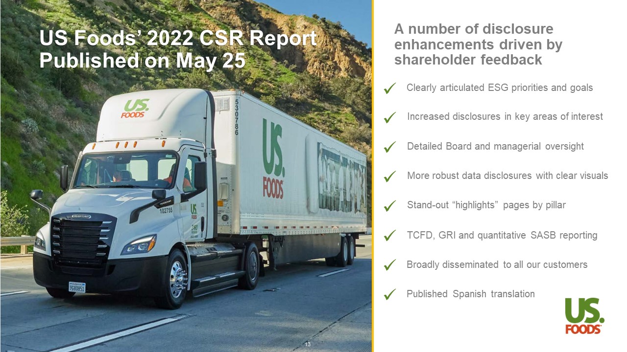 Executive Pay Aligned with Shareholder Interests Compensation Program Balances Performance Orientation and Shareholder Alignment Elements of Executive Pay and Related Objectives • Attracts talent and supports retention • Forms basis for AIP target award Base Salary • Links executive pay to US Foods’ financial performance • Drives the achievement of annual business objectives • 2023 AIP design includes primary Adjusted EBITDA metric (80%) and a new secondary metric (20%) regarding distribution cost per case, replacing local and national market share, which sends a strong signal to the entire organization that operational improvements are critical to achieving our long - range plan Annual Incentive Plan (AIP) Award • 50% of Long - Term Incentive Plan mix • Encourages executive retention through multi - year vesting schedule • Supports long - range plan by providing executive officers with an ownership stake in US Foods and aligning interests with those of our stockholders Restricted Stock Units (RSUs) • 50% of Long - Term Incentive Plan mix • Maintained Adjusted EBITDA growth rate (70%) and Return on Invested Capital (30%) PSU mix • Incentivize achievement of three - year financial goals and link executive pay to US Foods’ financial performance • Supports long - range plan by providing executive officers with an ownership stake in US Foods and aligning interests with those of our stockholders Performance Share Units (PSUs) • Compensate executives for leadership and performance during a period of transition • Ensure short - and medium - term stability across the US Foods’ leadership team Special Retention Awards 12