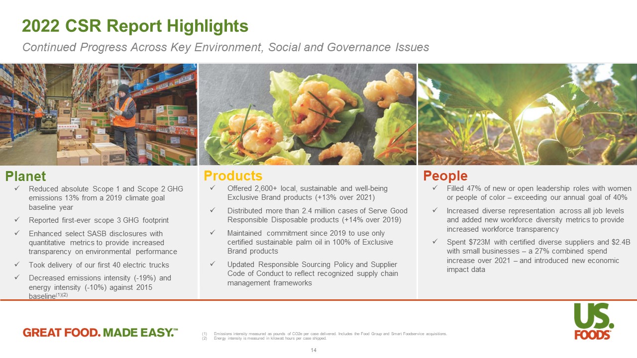US Foods’ 2022 CSR Report Published on May 25 x x x x x x x x Clearly articulated ESG priorities and goals Increased disclosures in key areas of interest Detailed Board and managerial oversight More robust data disclosures with clear visuals Stand - out “highlights” pages by pillar TCFD, GRI and quantitative SASB reporting Broadly disseminated to all our customers Published Spanish translation A number of disclosure enhancements driven by shareholder feedback 13