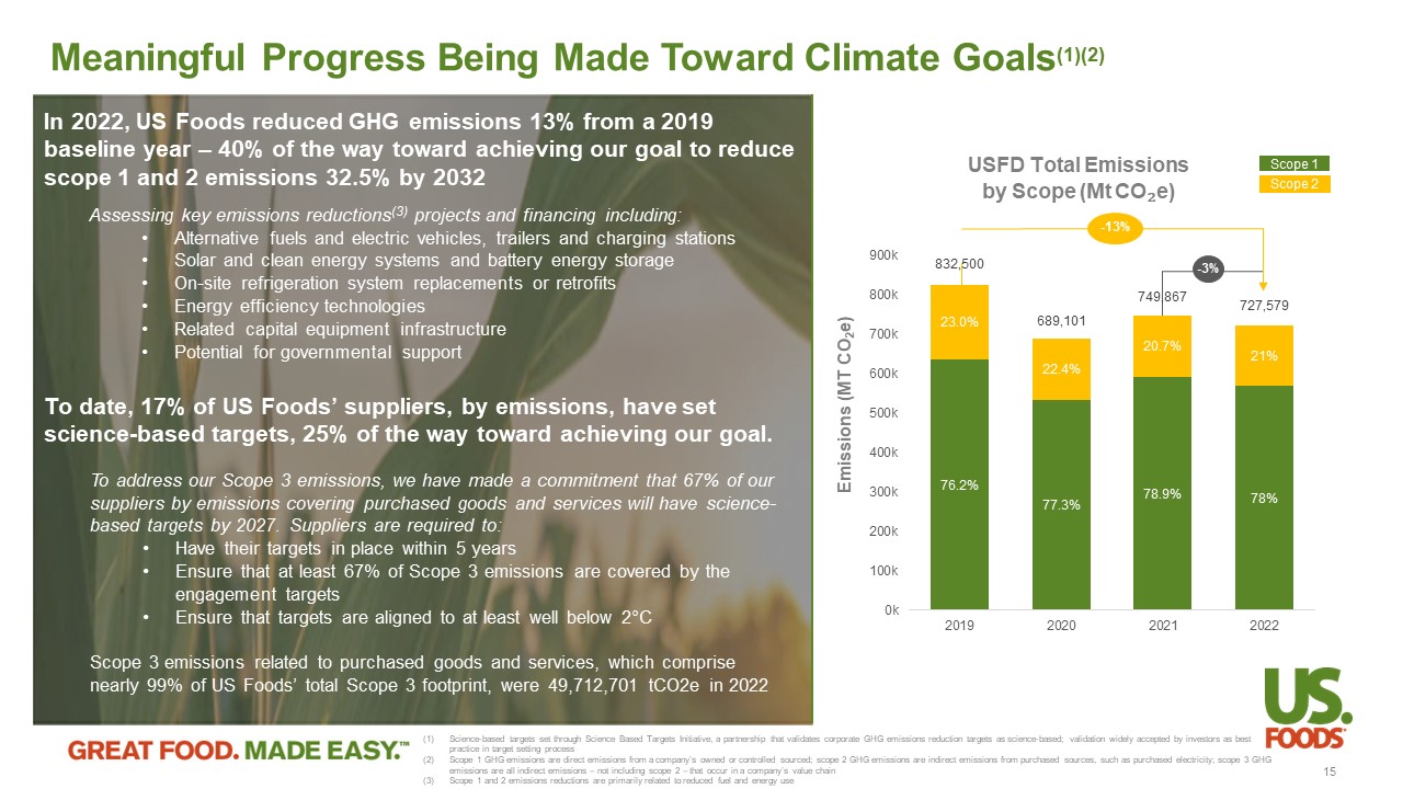 2022 CSR Report Highlights Continued Progress Across Key Environment, Social and Governance Issues Planet x Reduced absolute Scope 1 and Scope 2 GHG emissions 13% from a 2019 climate goal baseline year x Reported first - ever scope 3 GHG footprint x Enhanced select SASB disclosures with quantitative metrics to provide increased transparency on environmental performance x Took delivery of our first 40 electric trucks x Decreased emissions intensity ( - 19%) and energy intensity ( - 10%) against 2015 baseline (1)(2) People x Filled 47% of new or open leadership roles with women or people of color – exceeding our annual goal of 40% x Increased diverse representation across all job levels and added new workforce diversity metrics to provide increased workforce transparency x Spent $723M with certified diverse suppliers and $2.4B with small businesses – a 27% combined spend increase over 2021 – and introduced new economic impact data Products x Offered 2,600+ local, sustainable and well - being Exclusive Brand products (+13% over 2021) x Distributed more than 2.4 million cases of Serve Good Responsible Disposable products (+14% over 2019) x Maintained commitment since 2019 to use only certified sustainable palm oil in 100% of Exclusive Brand products x Updated Responsible Sourcing Policy and Supplier Code of Conduct to reflect recognized supply chain management frameworks (1) Emissions intensity measured as pounds of CO2e per case delivered. Includes the Food Group and Smart Foodservice acquisitions . (2) Energy intensity is measured in kilowatt hours per case shipped. 14