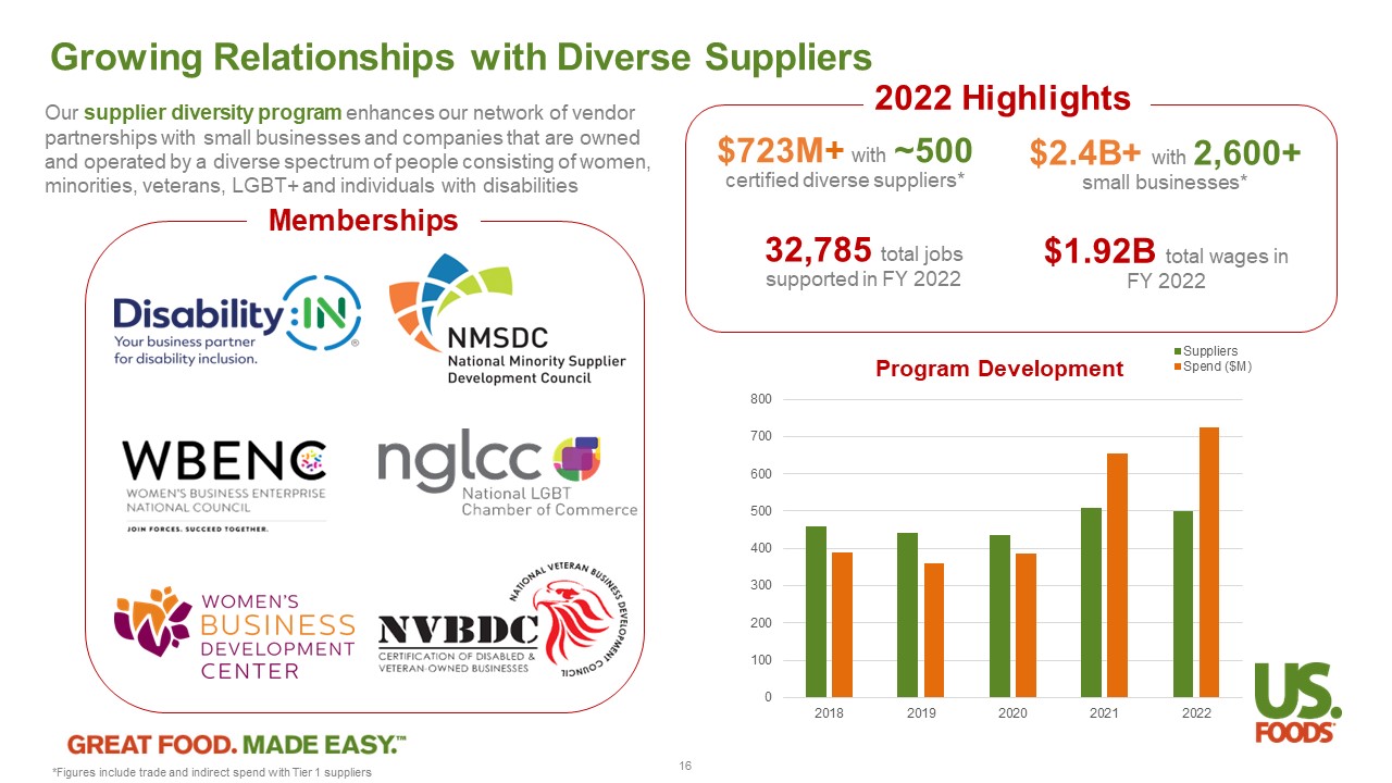 Meaningful Progress Being Made Toward Climate Goals (1)(2) Assessing key emissions reductions (3) projects and financing including : • Alternative fuels and electric vehicles, trailers and charging stations • Solar and clean energy systems and battery energy storage • On - site refrigeration system replacements or retrofits • Energy efficiency technologies • Related capital equipment infrastructure • Potential for governmental support USFD Total Emissions by Scope (Mt CO ₂ e) Emissions (MT CO 2 e) 76.2% 77.3% 78.9% 78% 23.0% 22.4% 20.7% 21% 832,500 689,101 749,867 727,579 0k 100k 200k 300k 400k 500k 600k 700k 800k 900k 2019 2020 2021 2022 Scope 1 Scope 2 - 3% - 13% In 2022, US Foods reduced GHG emissions 13% from a 2019 baseline year – 40% of the way toward achieving our goal to reduce scope 1 and 2 emissions 32.5% by 2032 To address our Scope 3 emissions, we have made a commitment that 67% of our suppliers by emissions covering purchased goods and services will have science - based targets by 2027. Suppliers are required to: • Have their targets in place within 5 years • Ensure that at least 67% of Scope 3 emissions are covered by the engagement targets • Ensure that targets are aligned to at least well below 2 ƒ C Scope 3 emissions related to purchased goods and services, which comprise nearly 99% of US Foods’ total Scope 3 footprint, were 49,712,701 tCO2e in 2022 To date, 17% of US Foods’ suppliers, by emissions, have set science - based targets, 25% of the way toward achieving our goal. (1) Science - based targets set through Science Based Targets Initiative, a partnership that validates corporate GHG emissions reduction targets as science - based; validation widely accepted by investors a s best practice in target setting process ​ (2) Scope 1 GHG emissions are direct emissions from a company’s owned or controlled sourced; scope 2 GHG emissions are indirect emis sions from purchased sources, such as purchased electricity​; scope 3 GHG emissions are all indirect emissions – not including scope 2 – that occur in a company’s value chain (3) Scope 1 and 2 emissions reductions are primarily related to reduced fuel and energy use ​ 15