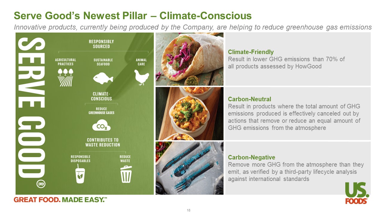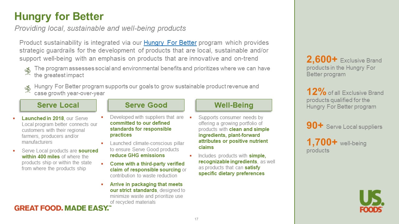 Providing local, sustainable and well - being products Product sustainability is integrated via our Hungry For Better program which provides strategic guardrails for the development of products that are local, sustainable and/or support well - being with an emphasis on products that are innovative and on - trend The program assesses social and environmental benefits and prioritizes where we can have the greatest impact Hungry For Better program supports our goals to grow sustainable product revenue and case growth year - over - year 2,600+ Exclusive Brand products in the Hungry For Better program 12% of all E xclusive Brand products qualified for the Hungry For Better program 90+ Serve Local suppliers 1,700+ well - being products Hungry for Better ▪ Launched in 2018 , our Serve Local program better connects our customers with their regional farmers, producers and/or manufacturers ▪ Serve Local products are sourced within 400 miles of where the products ship or within the state from where the products ship ▪ Developed with suppliers that are committed to our defined standards for responsible practices ▪ Launched climate - conscious pillar to ensure Serve Good products reduce GHG emissions ▪ Come with a third - party verified claim of responsible sourcing or contribution to waste reduction ▪ Arrive in packaging that meets our strict standards , designed to minimize waste and prioritize use of recycled materials ▪ Supports consumer needs by offering a growing portfolio of products with clean and simple ingredients, plant - forward attributes or positive nutrient claims ▪ Includes products with simple, recognizable ingredients , as well as products that can satisfy specific dietary preferences Serve Local Serve Good Well - Being 17