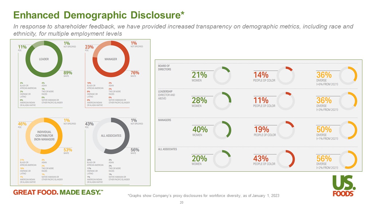 Embracing Diversity and Inclusion Our commitment to diversity and inclusion is grounded in three strategic areas of focus Creating a more inclusive work environment where everyone feels safe, valued and that their voices matter Increasing the diversity of our workforce and leaders by investing in programs to build a diverse talent pipeline and accelerate the development of our underrepresented associates Supporting underserved communities and businesses by enhancing our outreach 56% of our associates were women or people of color as of January 1, 2023, up from 54% in January 2022 47% of our new or open leadership roles were filled by women or people of color in 2022 Coordinated 72 pairings for our 2022 cohort of the Learning Partners Program Launched D&I training for Culinary & Restaurant Operations Onboarded five external talent - attraction partners Assigned Bias Training eLearning to 10,000+ associates, managers and leaders Expanded functional representation dashboards designed to assess progress towards a holistic and innovative workforce Sponsored 9 Employee Resource Groups that provide community and education across the organization; 11,000 associates attended more than 95 events Hosted D&I Regional Roundtable in partnership with the Multicultural Foodservice & Hospitality Alliance Introduced and conducted ten Power of Dialogue Sessions to understand D&I awareness, readiness and opportunities 1 2 3 19