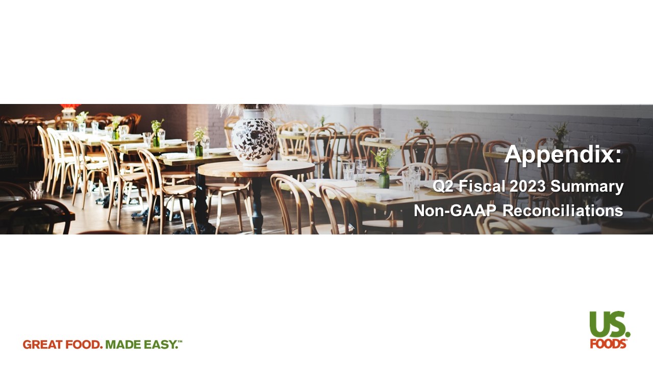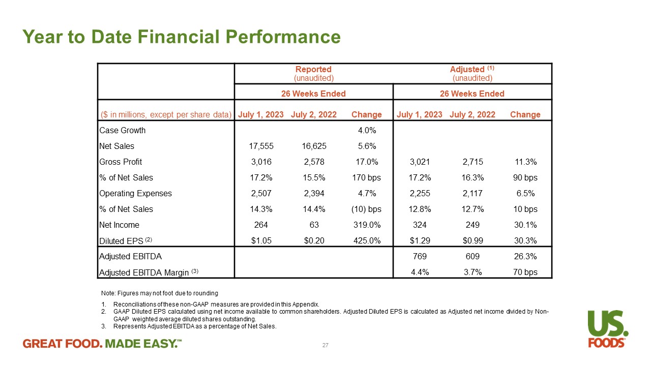 Year to Date Financial Performance Note : Figures may not foot due to rounding 1. Reconciliations of these non - GAAP measures are provided in this Appendix . 2. GAAP Diluted EPS calculated using net income available to common shareholders . Adjusted Diluted EPS is calculated as Adjusted net income divided by Non - GAAP weighted average diluted shares outstanding . 3. Represents Adjusted EBITDA as a percentage of Net Sales . Adjusted (1) (unaudited) Reported (unaudited) 26 Weeks Ended 26 Weeks Ended Change July 2, 2022 July 1, 2023 Change July 2, 2022 July 1, 2023 ($ in millions, except per share data) 4.0% Case Growth 5.6% 16,625 17,555 Net Sales 11.3% 2,715 3,021 17.0% 2,578 3,016 Gross Profit 90 bps 16.3% 17.2% 170 bps 15.5% 17.2% % of Net Sales 6.5% 2,117 2,255 4.7% 2,394 2,507 Operating Expenses 10 bps 12.7% 12.8% (10) bps 14.4% 14.3% % of Net Sales 30.1% 249 324 319.0% 63 264 Net Income 30.3% $0.99 $1.29 425.0% $0.20 $1.05 Diluted EPS (2) 26.3% 609 769 Adjusted EBITDA 70 bps 3.7% 4.4% Adjusted EBITDA Margin (3) 27
