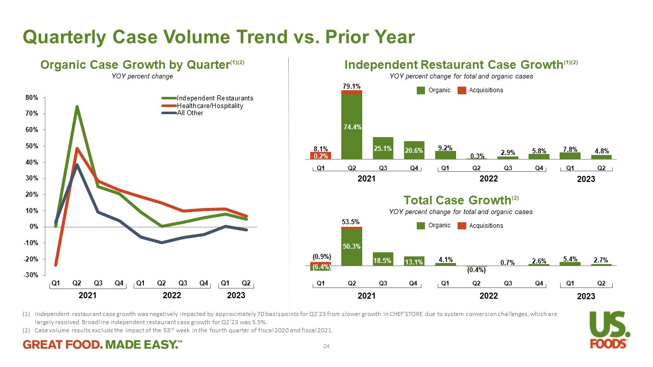 Quarterly Case Volume Trend vs. Prior Year Independent Restaurant Case Growth (1)(2) YOY percent change for total and organic cases 0.2% 74.4% 25.1% 20.6% 9.2% 0.3% 2.9% 5.8 % 7.8 % 4.8 % 8.1% 79.1% Q1 Q2 Q3 Q4 Q1 Q2 Q3 Q4 Q1 Q2 Organic Case Growth by Quarter (1)(2) YOY percent change -30% -20% -10% 0% 10% 20% 30% 40% 50% 60% 70% 80% Q1 Q2 Q3 Q4 Q1 Q2 Q3 Q4 Q1 Q2 Independent Restaurants Healthcare/Hospitality All Other 2021 Acquisitions Organic (6.4%) 50.3% 18.5% 13.1% 4.1% (0.4%) 0.7% 2.6 % 5.4 % 2.7 % (0.9%) 53.5% Q1 Q2 Q3 Q4 Q1 Q2 Q3 Q4 Q1 Q2 2021 2022 2022 2023 2023 2021 2022 2023 24 Acquisitions Organic (1) Independent restaurant case growth was negatively impacted by approximately 70 basis points for Q2’23 from slower growth in C HEF ’STORE due to system conversion challenges, which are largely resolved. Broadline independent restaurant case growth for Q2’23 was 5.5%. (2) Case volume results exclude the impact of the 53 rd week in the fourth quarter of fiscal 2020 and fiscal 2021. Total Case Growth (2) YOY percent change for total and organic cases